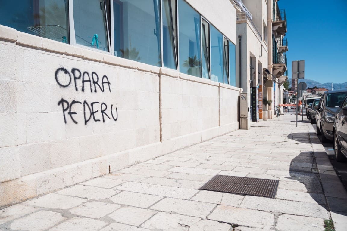 Crnim sprejem na više mjesta je ispisano "Opara pederu". Na Poljudu stoji "Gubo mrš sa Poljuda!", ali i "Opara ti si ono crno ispod nokta!".