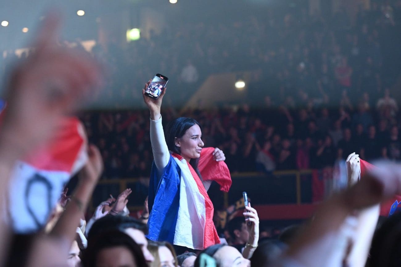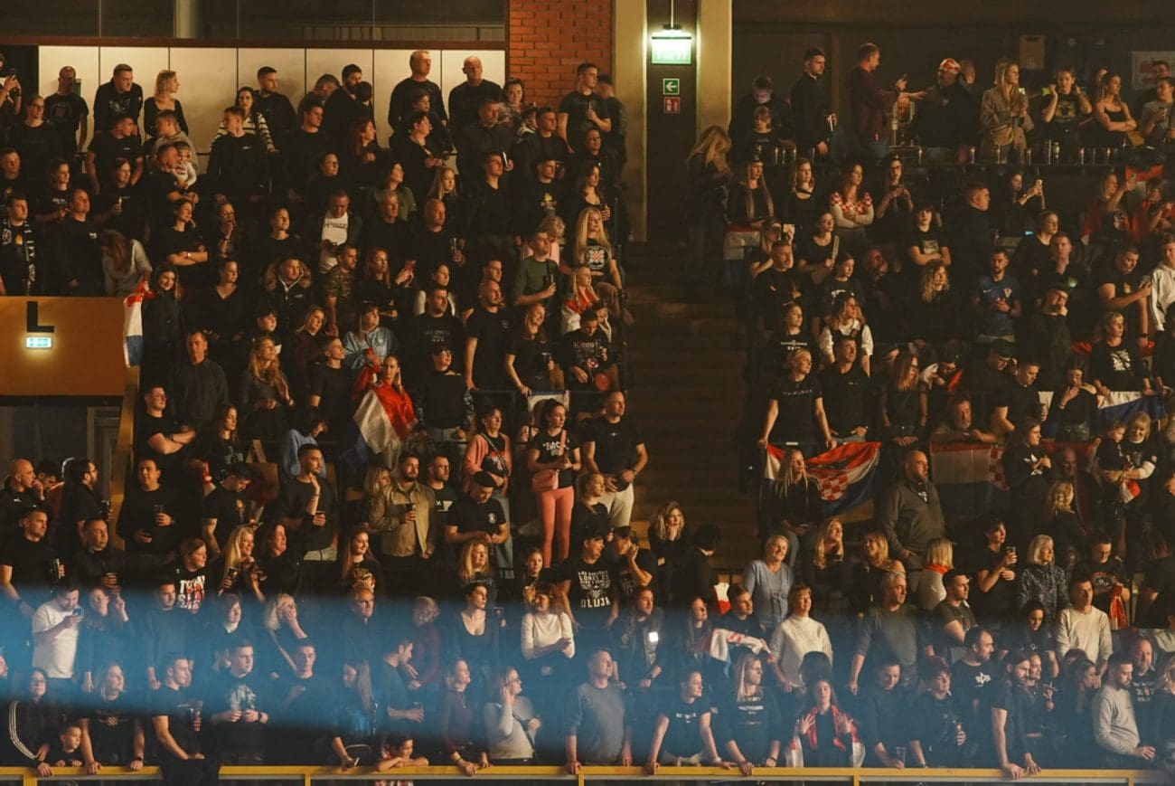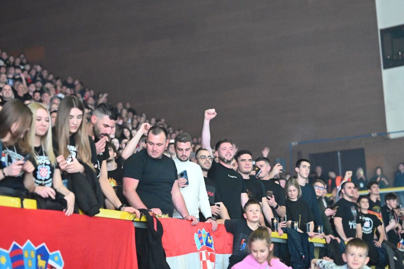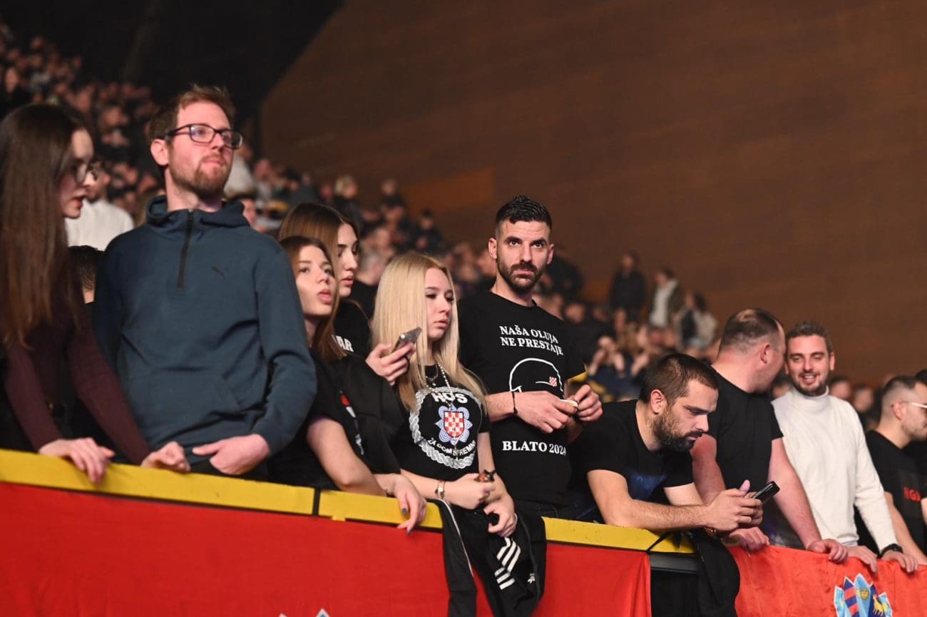 Publika je u deliriju, vijore se zastave...na video zidu ide poruka prvog hrvatskog predsjednika dr. Franje Tuđmana.