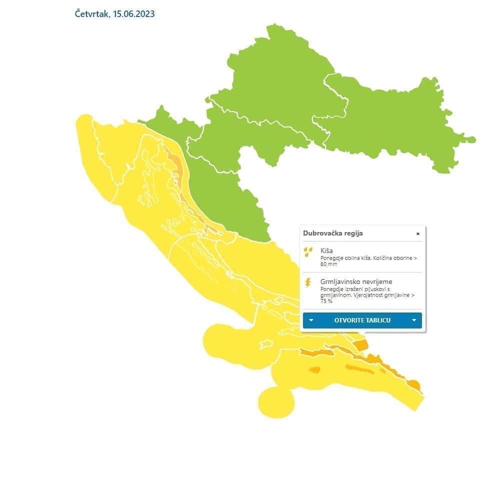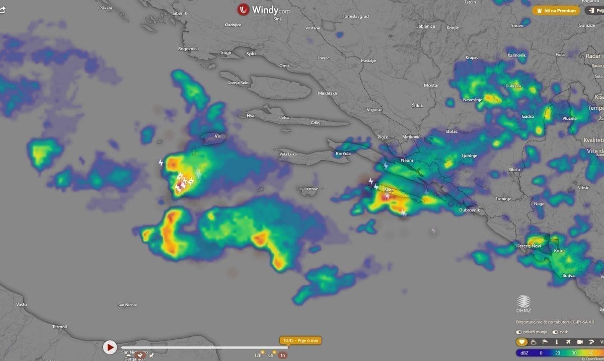 Naime, područje otvorenog mora i vanjskih otoka već su danas zahvatile grmljavinske nestabilnosti. Najjače nevrijeme zahvatilo je dijelove otoka Mljeta gdje ima i tuče, ali i većih količina kiše u kratkom vremenu. Nešto kiše ima na području od Ploča do Dubrovnika, ali za sada tek slabog intenziteta. Još jedno grmljavinsko nevrijeme nalazi se južno od Visa i Biševa sredinom jutra.