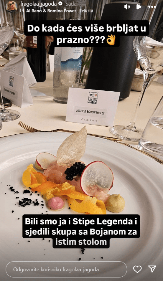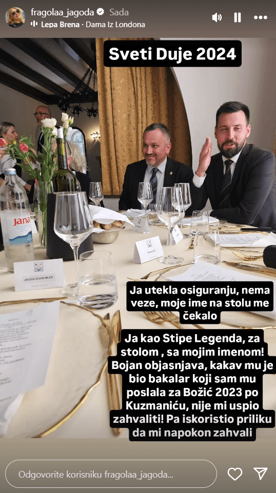 'Ja utekla osiguranju, nema veze, moje ime na stolu me čekalo. Ja kao Stipe Legenda, za stolom, sa mojim imenom! Bojan objašnjava, kakav mu je bio bakalar kojeg sam mu poslala za Božić 2023. godine po Kuzmaniću, nije mi uspio zahvalit. Pa iskoristio priliku da mi napokon zahvali', napisala je "grofica".
