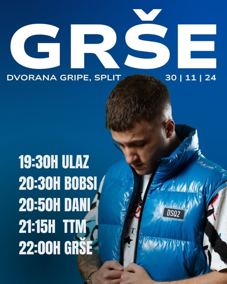 Nakon spektakularnih nastupa u zagrebačkom Domu sportova i riječkom Exportdrvu, triljski reper Grše ove subote, 30. studenog, dolazi pred splitsku publiku. Koncert će se održati u dvorani Gripe i predstavlja njegov najveći samostalni nastup u Dalmaciji.