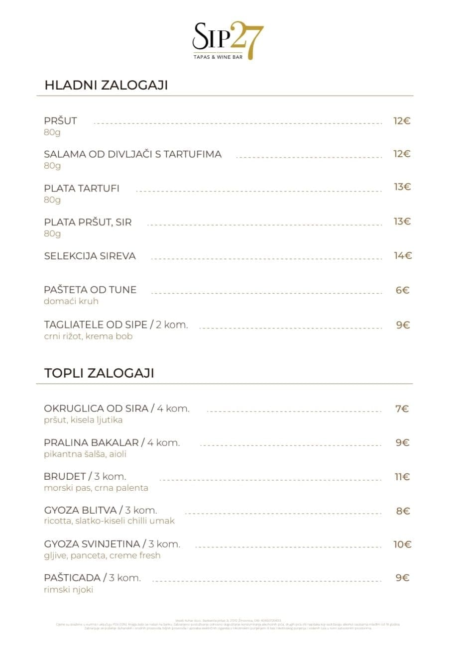 Vinska lista Sip27 pažljivo je sastavljena kako bi zadovoljila i najzahtjevnija nepca. Očekuje vas širok izbor domaćih i stranih etiketa, s posebnim naglaskom na autohtone sorte.