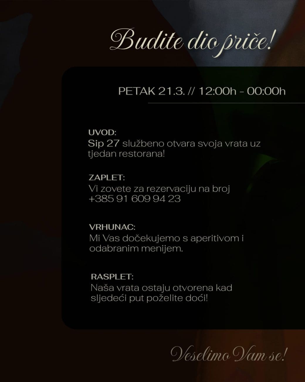 Od 21. do 30. ožujka, Sip27 će gostima, kroz sudjelovanje u Tjednu restorana, otvoriti vrata svakodnevno od 12:00 do 24:00 h. U tom razdoblju moći ćete isprobati posebno osmišljene mesne, riblje i vege menije, koji će dočarati filozofiju bara – kreativne i sofisticirane male zalogaje uparene s vrhunskim vinima. Rezervacije su moguće pozivom na broj 091/6099423.