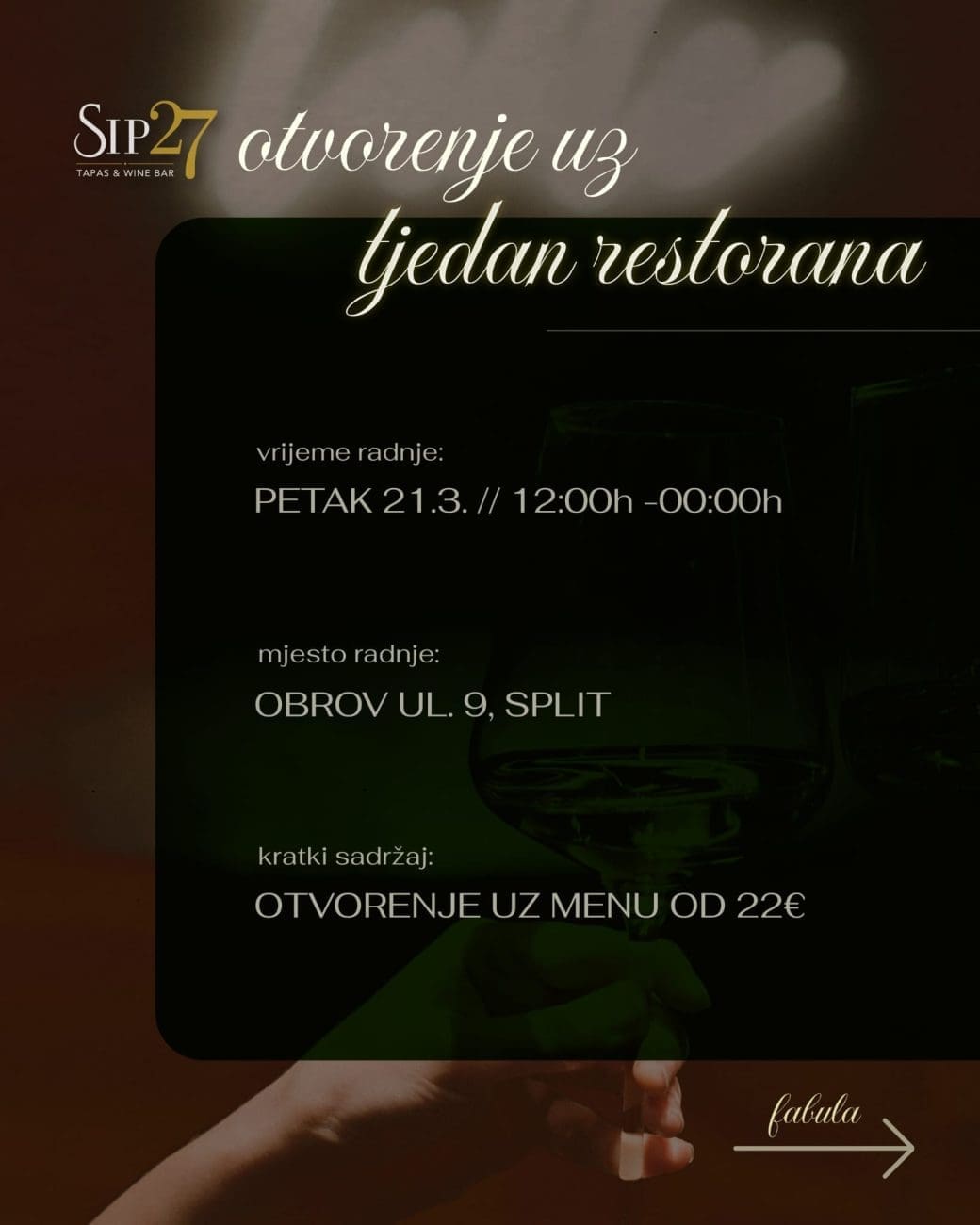 Točno kako su i obećali, na prvi dan proljeća Sip27 otvara vrata s posebnom ponudom menija u sklopu Tjedna restorana po atraktivnoj cijeni od 22 eura po osobi. Smješten u srcu Splita, na adresi Obrov ulica 9, Sip27 spaja vrhunsku hranu s kapljicom vina i opuštenom atmosferom, pozivajući sve ljubitelje gastronomskih užitaka na jedinstveno iskustvo.