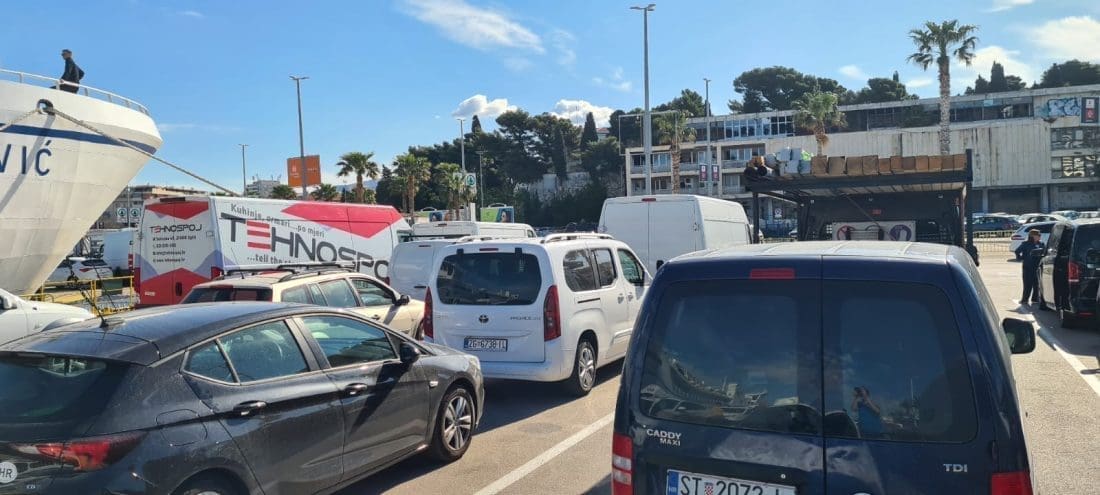 Od ranog jutra u splitskoj trajektnoj luci vlada gužva pred trajektom za otok Brač. Na trajekt koji je isplovio u 6:15 ostalo je više desetaka neukrcanih automobila i kamiona.