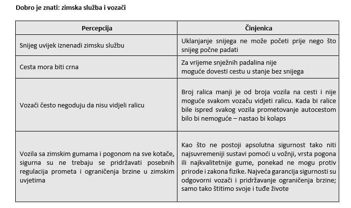- Naročito apeliramo na vozače da prije puta provjere stanje na cestama, ne kreću bez zimske opreme te da ne pretječu ralice. Dok traju snježne padaline brzinu vožnje potrebno je prilagoditi trenutnim uvjetima i ograničenjima na autocesti.