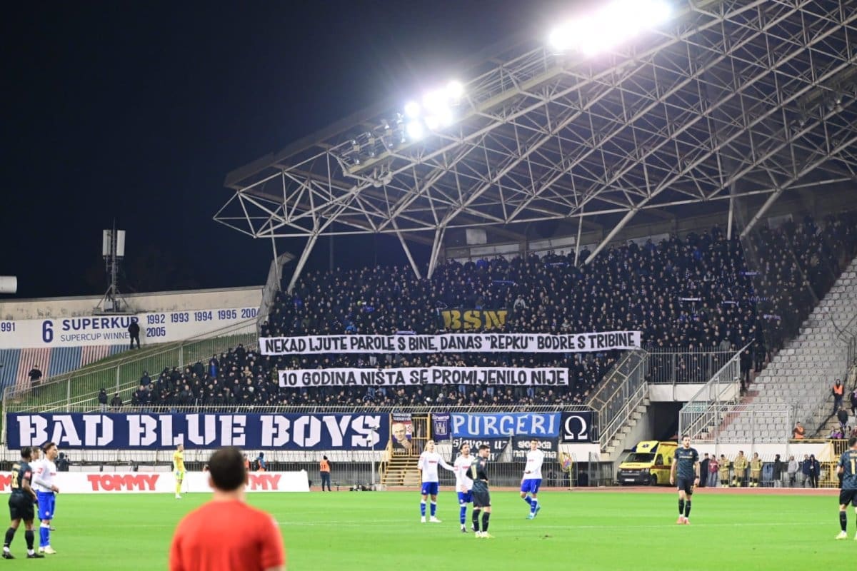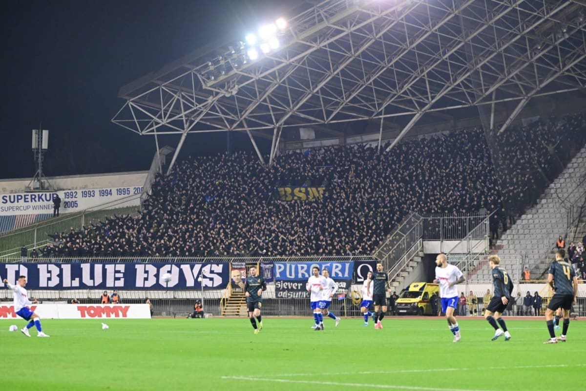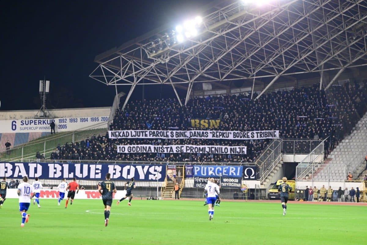 74' - Igra je nastavljena nakon 4 minute, a BBB bacili su dvije bengalke na zapadnu tribinu među navijače.