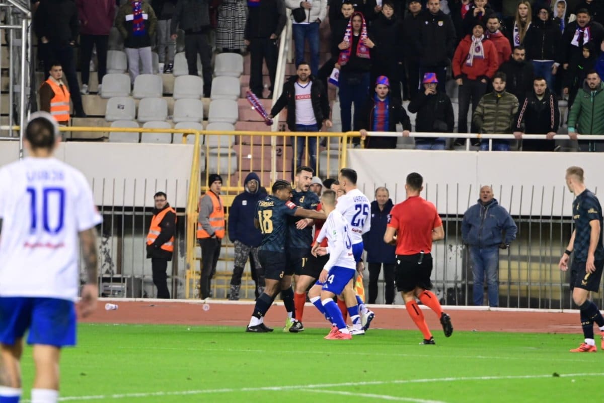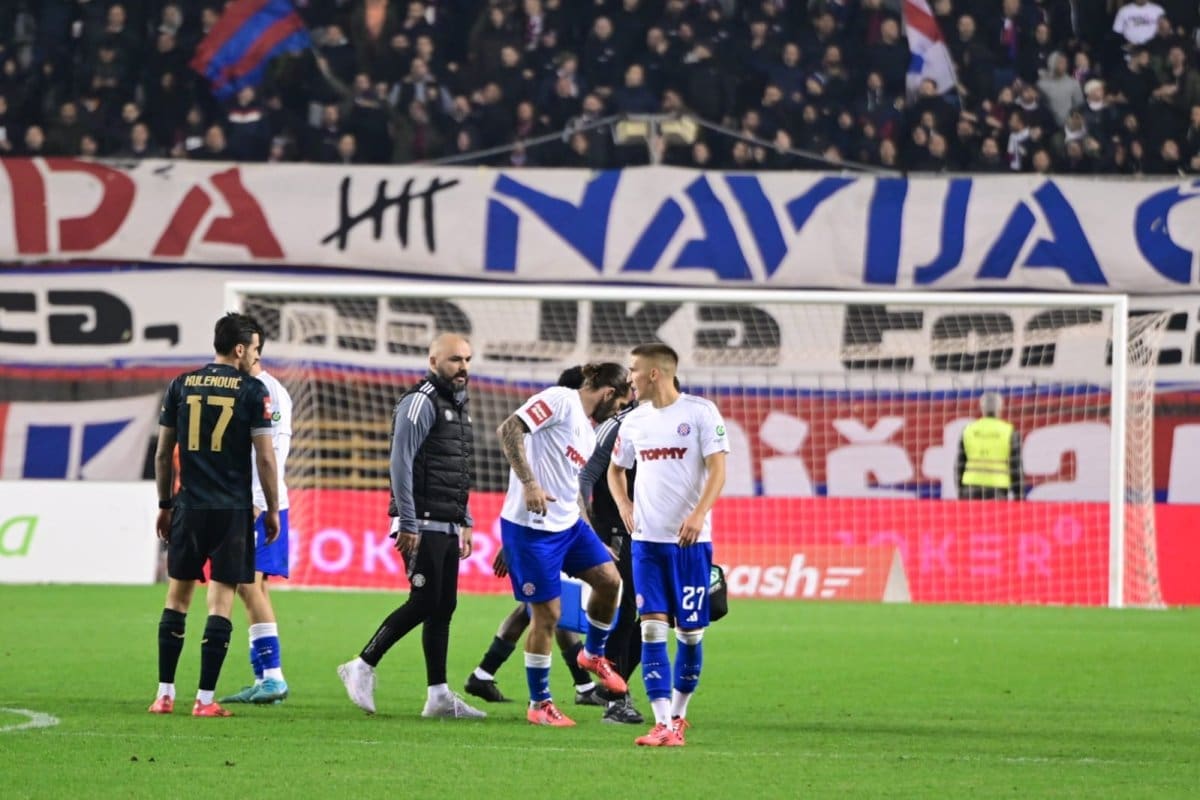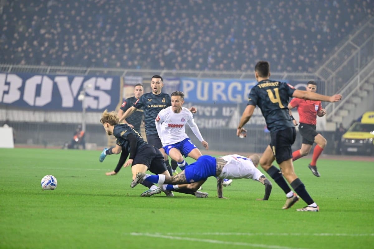 90'+2 - Dinamo je dobio slobodni udarac s gotovo polovice terena, a Diallo je požutio. Krovinovića je potom zamijenio Elez, a požutjela je i Hajdukova klupa.