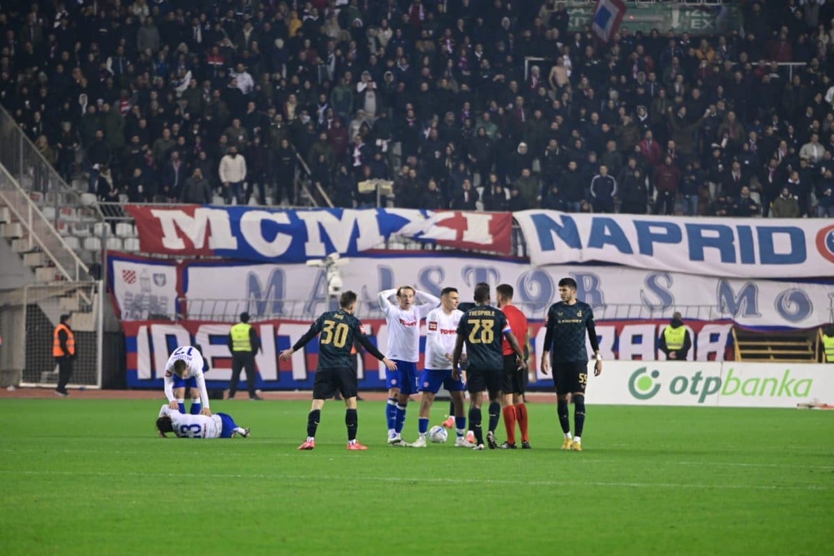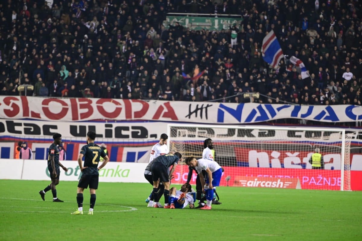 79' - Diallo je ostao ležati nakon sraza s Mbukuom, intervenirala je liječnička ekipa, a u međuvremenu su BBB gađali fotografe i teren, a jedna je baklja završila opet na Zapadu, među publikom.