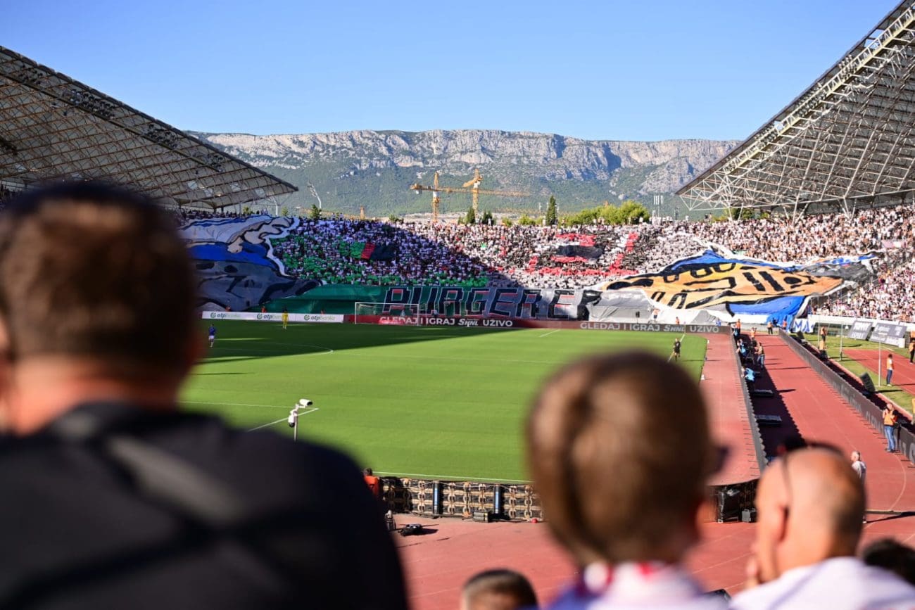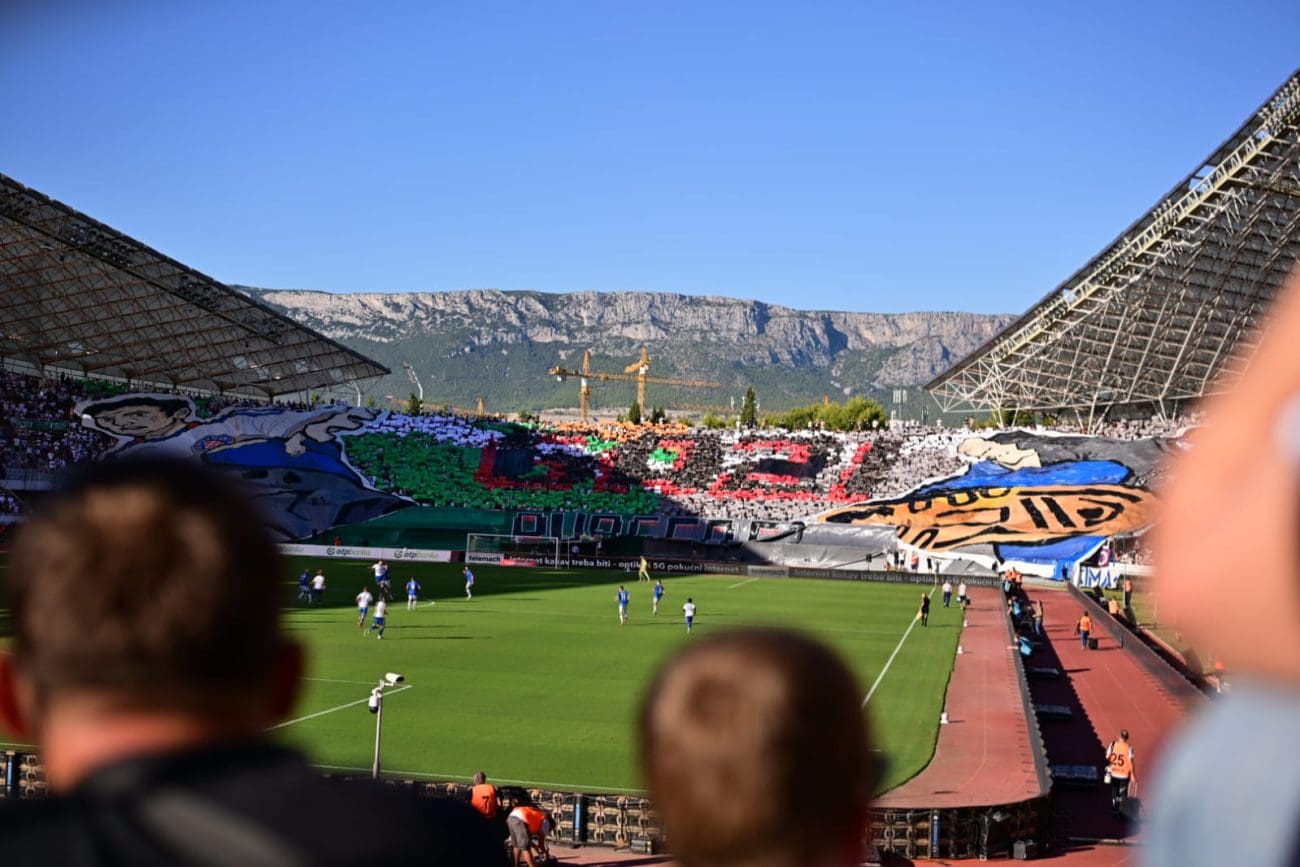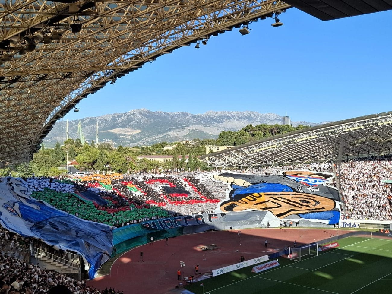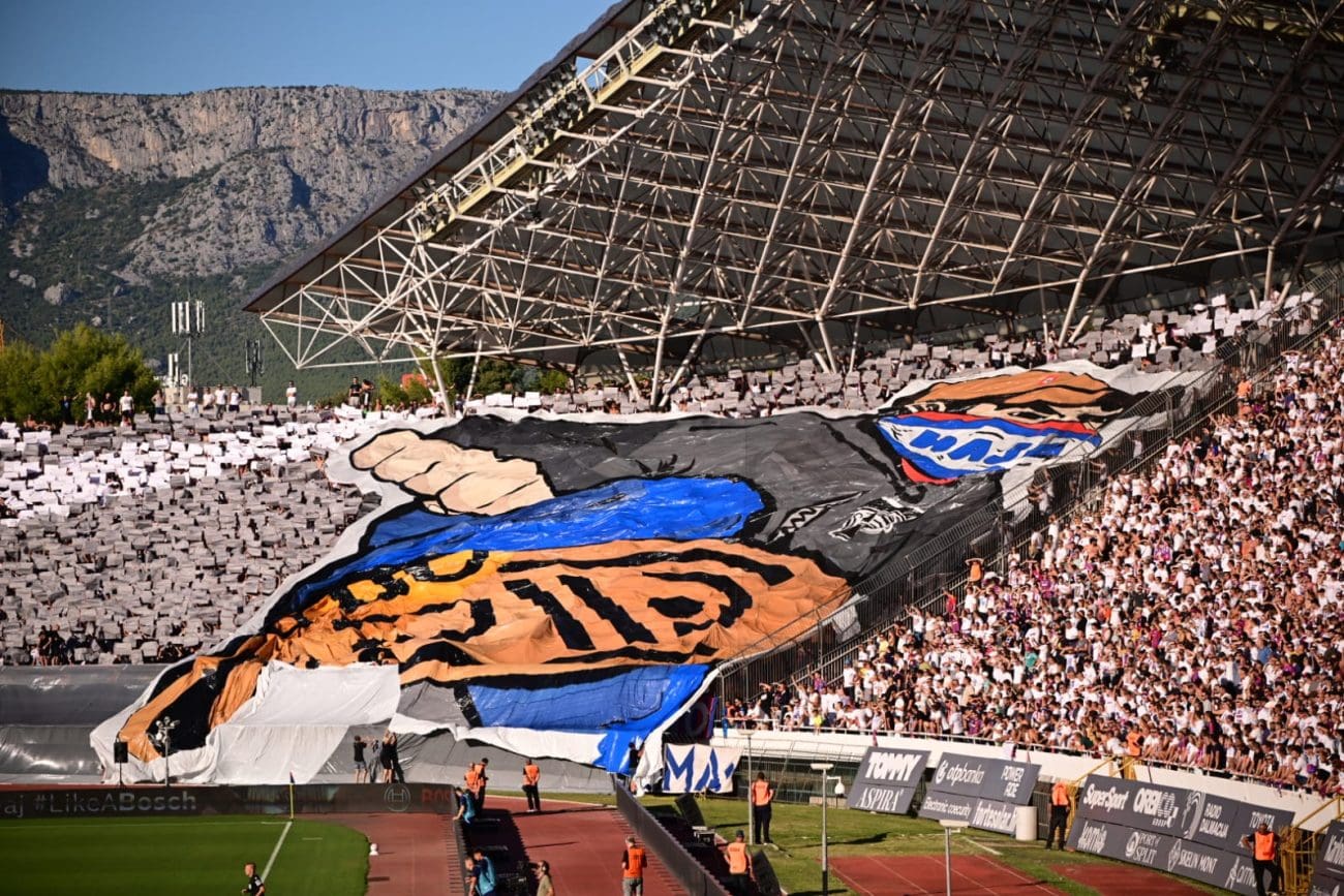 Uoči samog početka susreta Torcida je preko Sjevera razvila koreografiju: dva navijača Hajduka i njihove tenisice okrenute prema terenu. Sve je postalo puno jasnije kada su izmijenili dio koreografije: na tribini je osvanuo natpis „GAZI“, a na ogradi „PURGERE“.