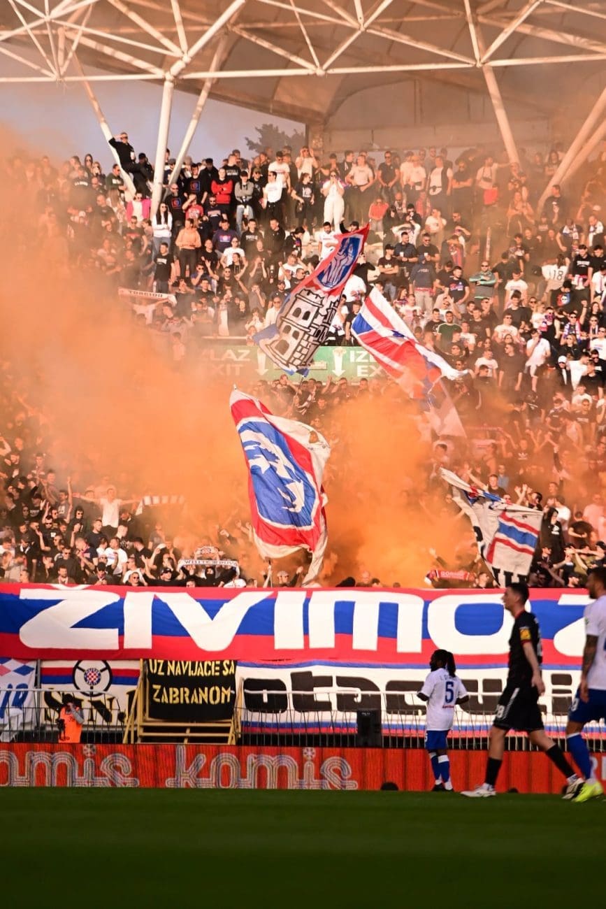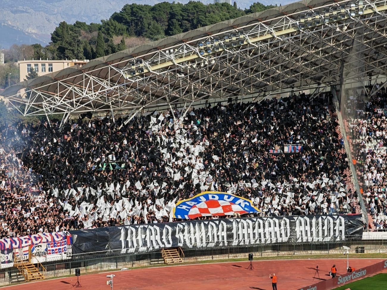 19' - Torcida je razvila koreografiju preko sjeveroistoka, pola je Hajdukova grba bilo iznad transparenta: "IDEMO SVUDA IMAMO MUDA", a ostatak je mahao crno-bijelim zastavama.
