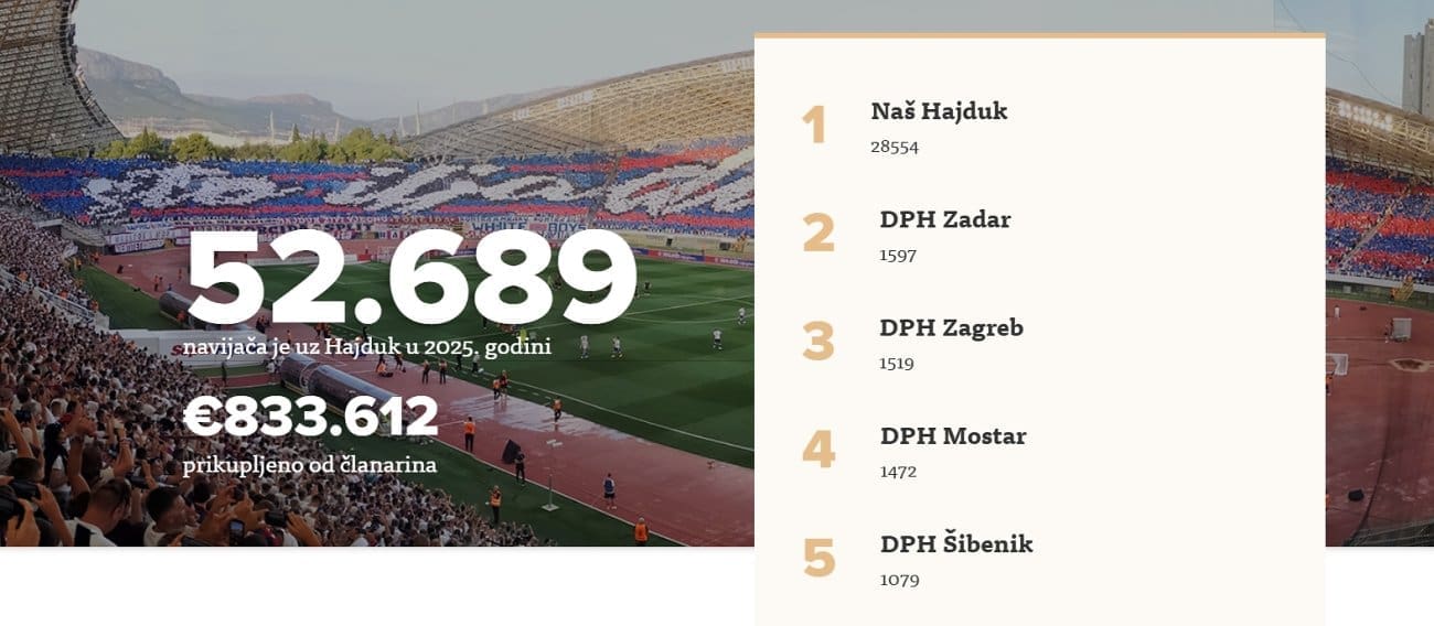 Splitski nogometni klub Hajduk u 2025. godini broji čak 52.689 članova, što ga ponovno svrstava među najpodržavanije sportske kolektive u regiji. Do sada je od članarina prikupljeno impresivnih 833.612 eura, čime se dodatno potvrđuje velika privrženost navijača klubu s Poljuda.