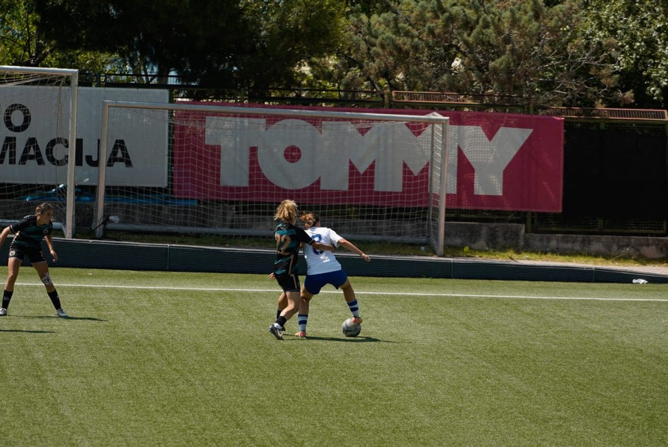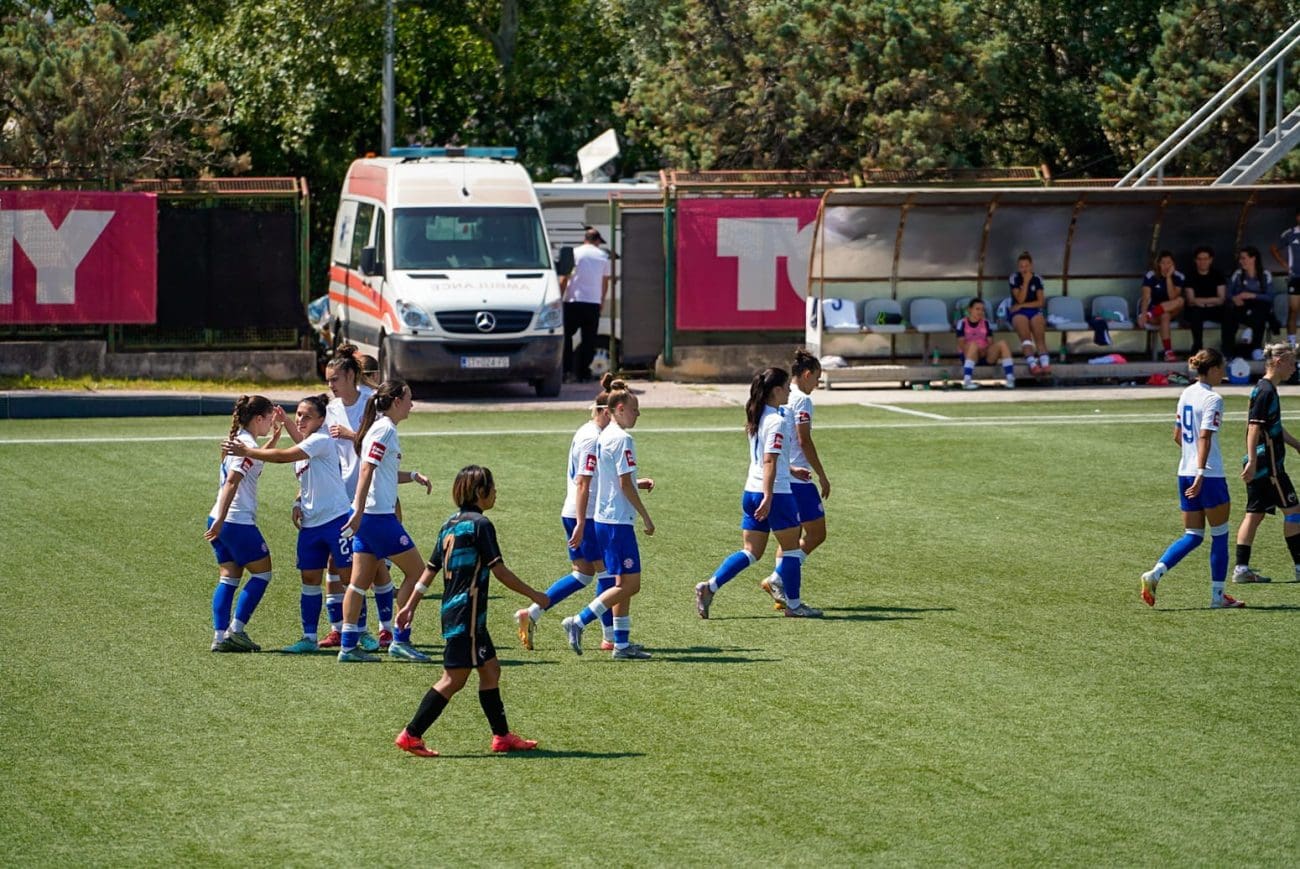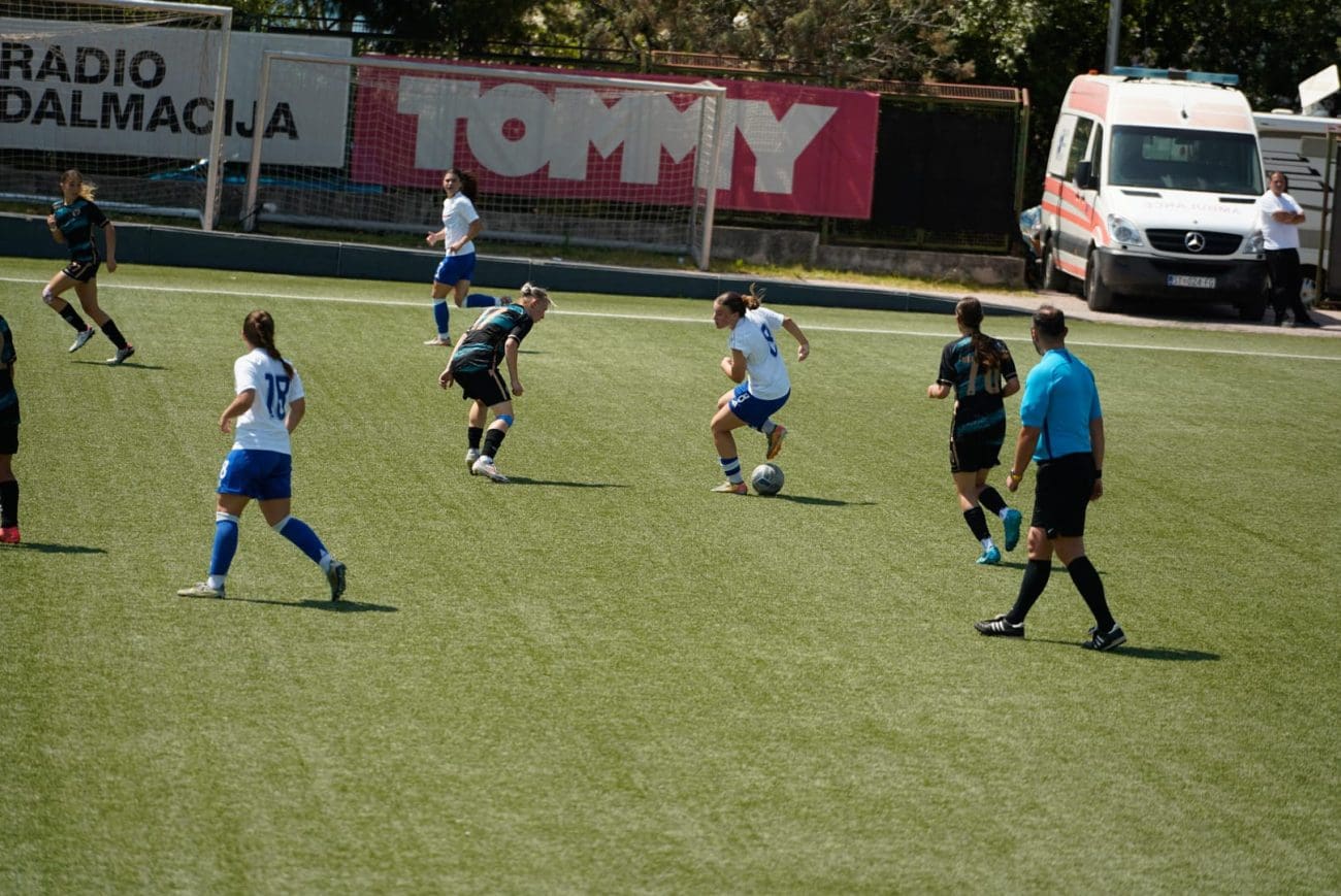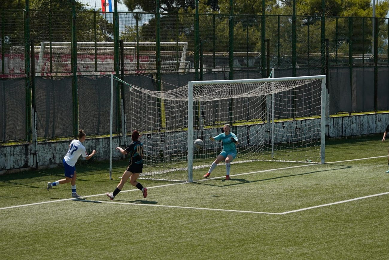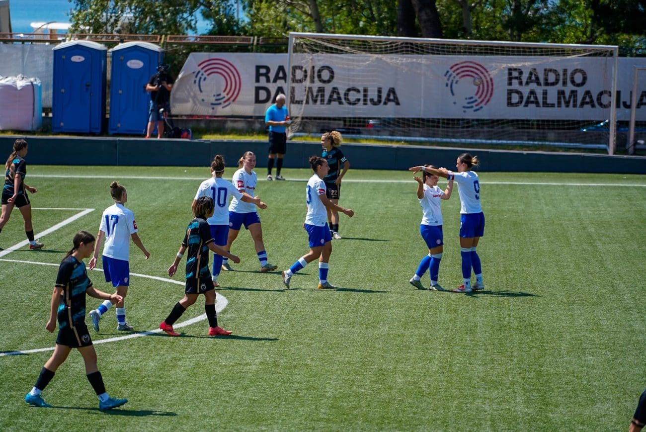 Bijele su povele već u 8. minuti kada je Kukavica nakon ubačaja s desne strane poslala loptu u mrežu za 1:0, a potom je Bagarić povećala vodstvo dvama pogocima. U 28. je minuti pogodila donji lijevi kut gostujućih vrata s 18 metara, a u devet minuta kasnije nakon prolaska kroz sredinu, efektnim se lažnjakom oslobodila svoje čuvarice i pogodila desni kut za 3:0. Posljednji gol poluvremena zabila je Brnić nakon što je Bakalar izvela korner s lijeve strane. Brnić je bila najviša u skoku i sa pet metara glavom je poslala loptu u mrežu za 4:0 na poluvremenu.