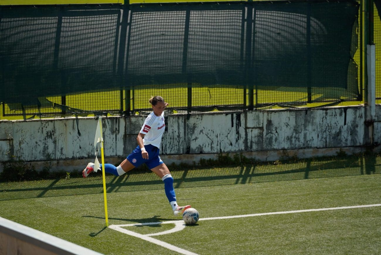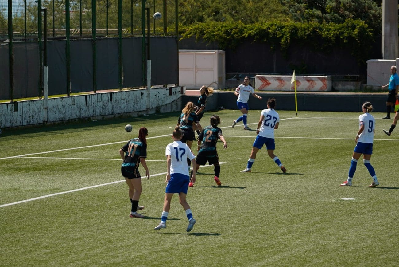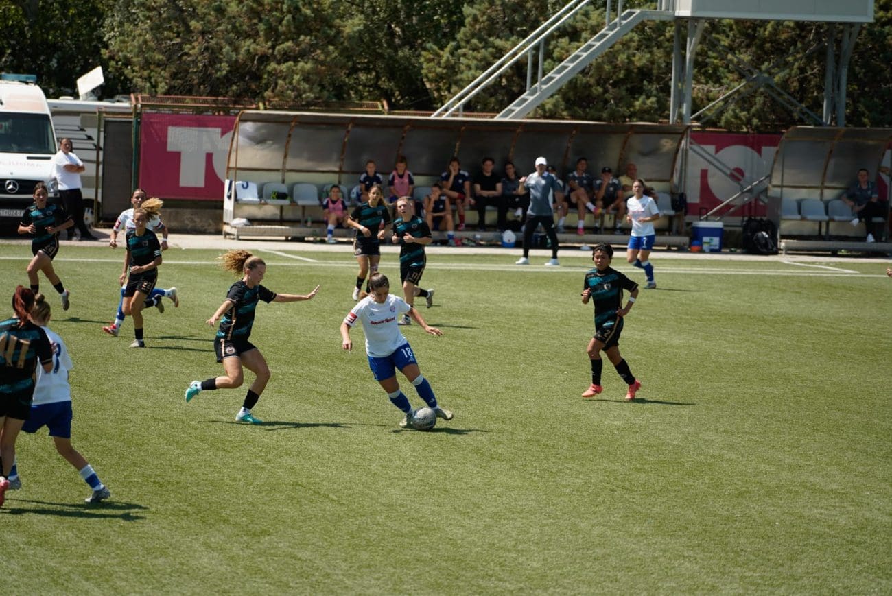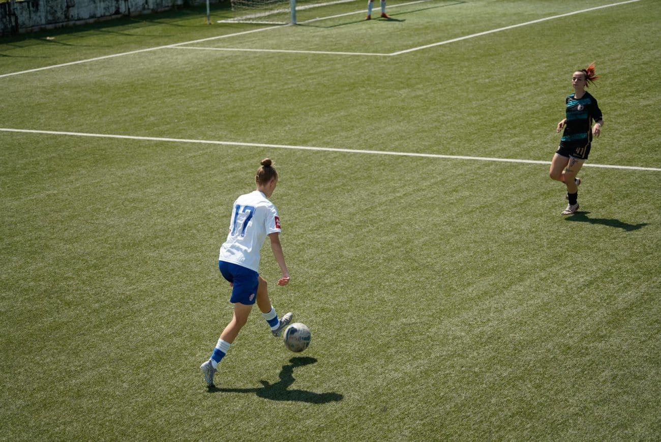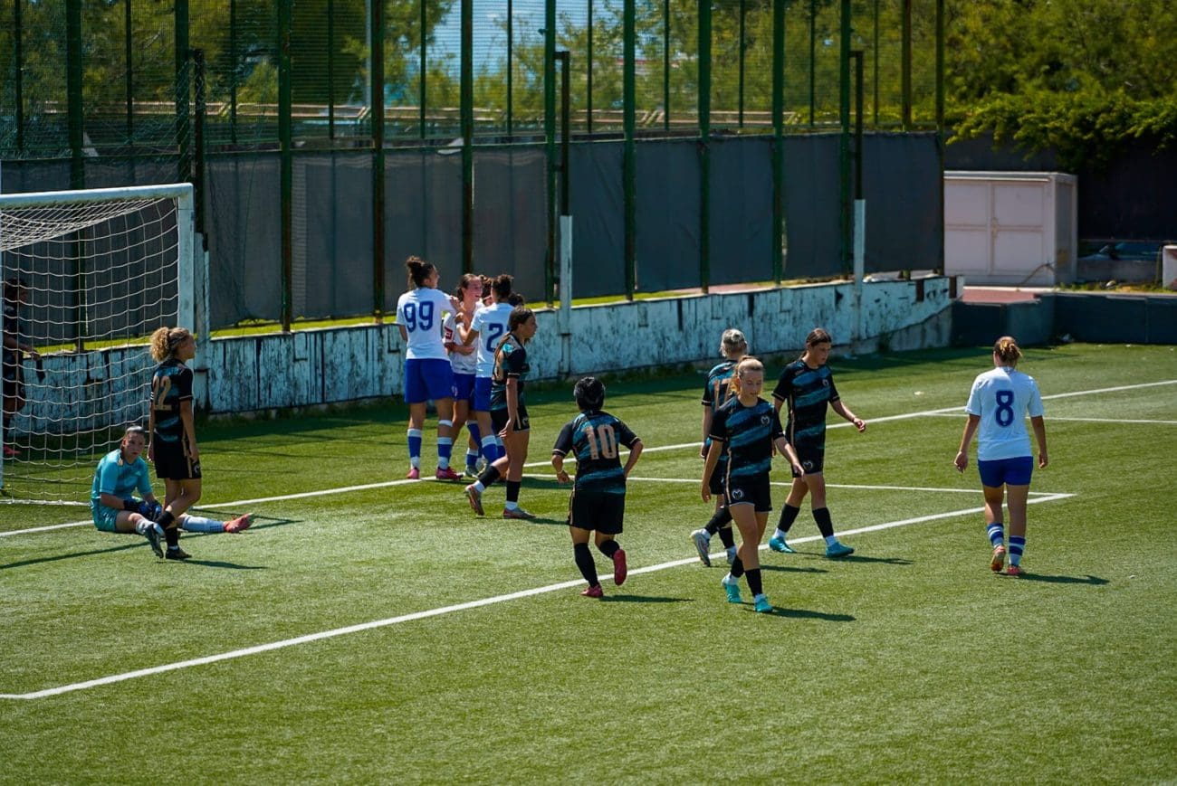 Bijele su povele već u 8. minuti kada je Kukavica nakon ubačaja s desne strane poslala loptu u mrežu za 1:0, a potom je Bagarić povećala vodstvo dvama pogocima. U 28. je minuti pogodila donji lijevi kut gostujućih vrata s 18 metara, a u devet minuta kasnije nakon prolaska kroz sredinu, efektnim se lažnjakom oslobodila svoje čuvarice i pogodila desni kut za 3:0. Posljednji gol poluvremena zabila je Brnić nakon što je Bakalar izvela korner s lijeve strane. Brnić je bila najviša u skoku i sa pet metara glavom je poslala loptu u mrežu za 4:0 na poluvremenu.