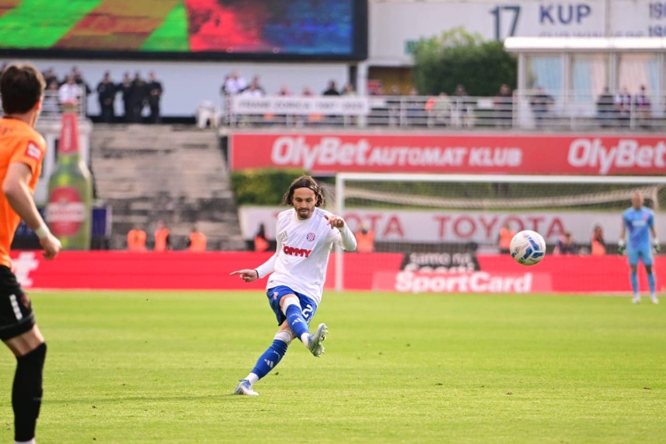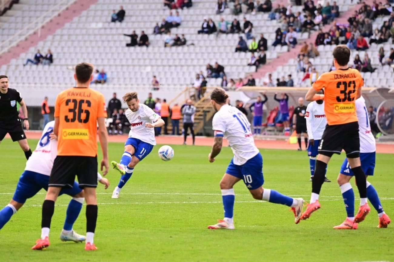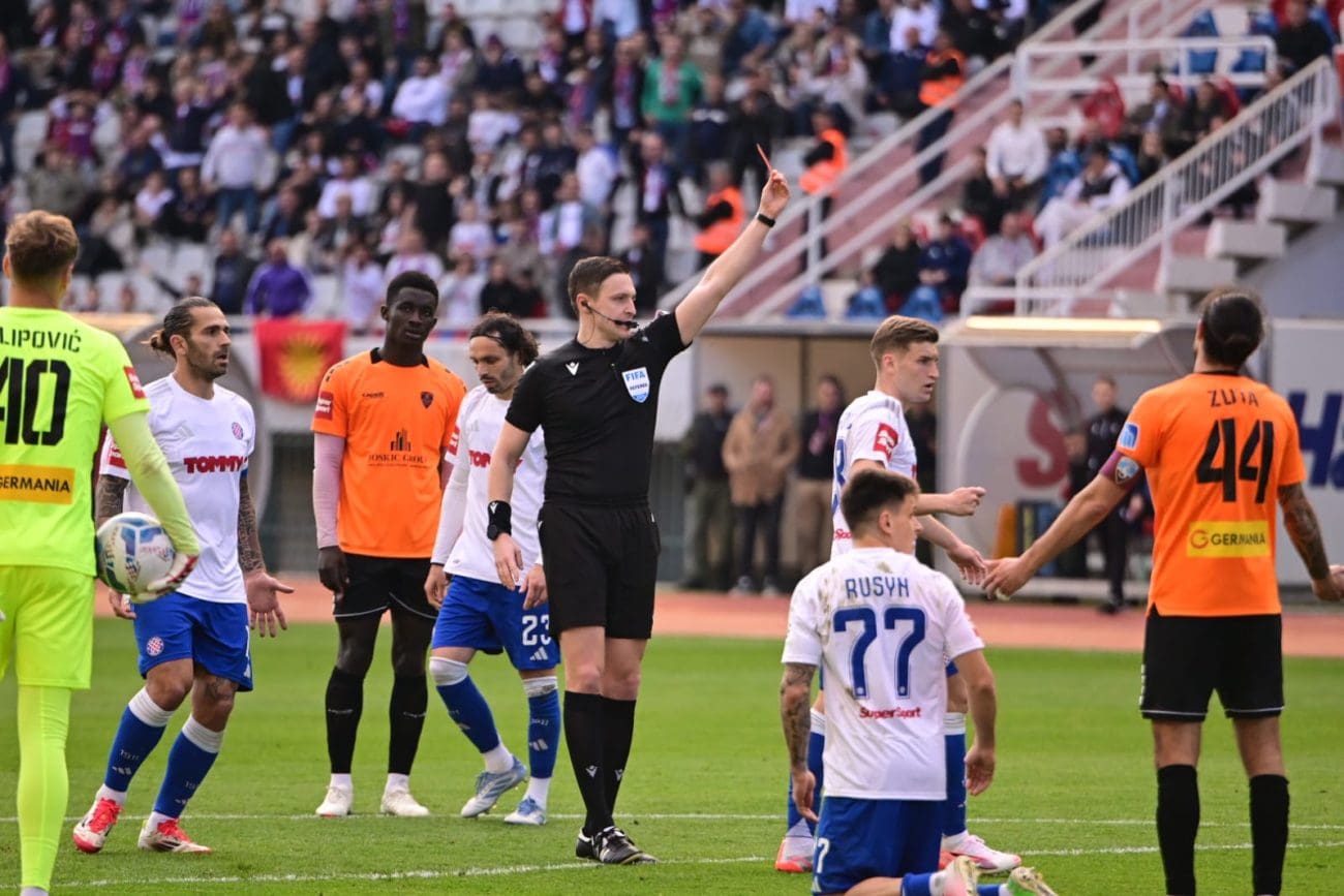 U 57. je minuti Livaja krasno proigrao Rusyna, a njega je s leđa srušio Cvek koji je dobio izravni crveni karton. Rusyn je pao ispred kaznenog prostora, a dosuđen je slobodni udarac za Hajduk. Izveo ga je Rakitić koji je matirao nemoćnog Filipovića za erupciju Poljuda i vodstvo Hajduka od 1:0.