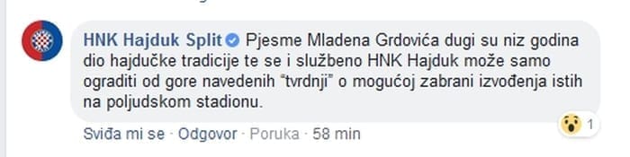 "Pjesme Mladena Grdovića dugi su niz godina dio hajdučke tradicije te se i službeno HNK Hajduk može samo ograditi od gore navedenih “tvrdnji” o mogućoj zabrani izvođenja istih na poljudskom stadionu".