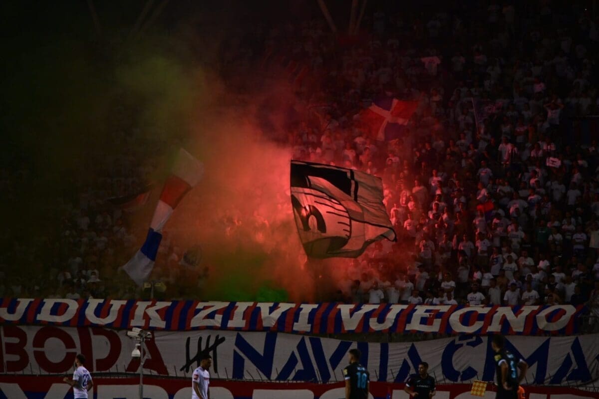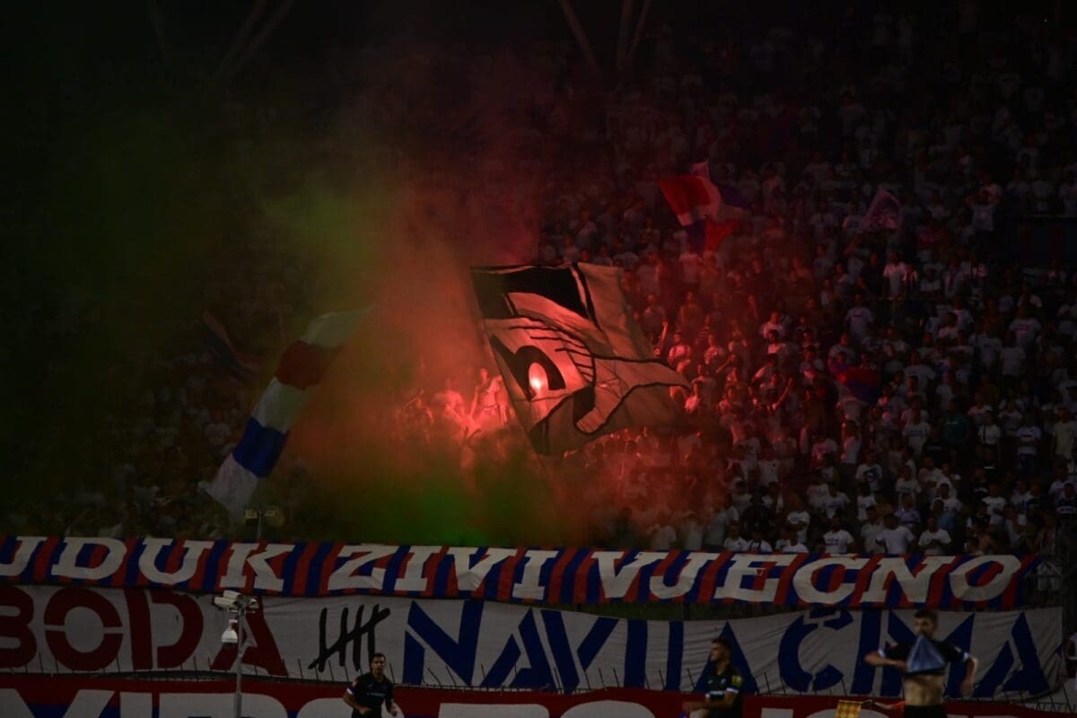 21:18 - Na sjeveru je podignut transparent "Ajde sada kao nekada, na krilima 14000 fanatika!".