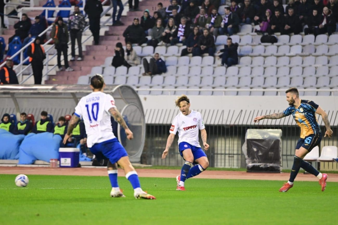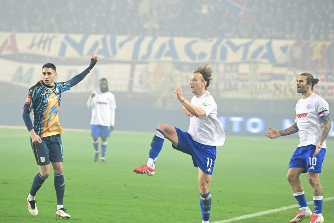 58' - Hajduk je nakon pet minuta konačno izveo slobodni udarac, u nastavku je akcije Zlomislić jedva obranio ubačaj/šut Šege, lopta je završila u korneru. Izveo ga je Rakitić, a Zlomislić je ostao ležati nako sraza s Prpićem.