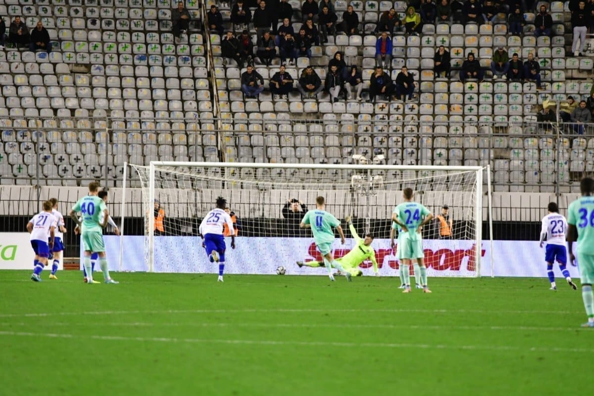 U 43. minuti Awaziem je blokirao Polterov udarac, sudac je dosudio igranje rukom i pokazao na bijelu točku, uz žuti karton Hajdukovu stoperu. Siguran je izvođač najstrože kazne za 1:2 bio Bülter. Mollet je potom požutio zbog oštra starta na Sahitiju, što je ujedno bio zadnji pokušaj u prvome poluvremenu.