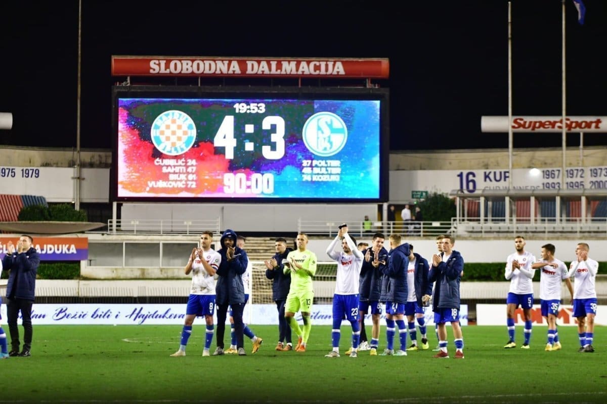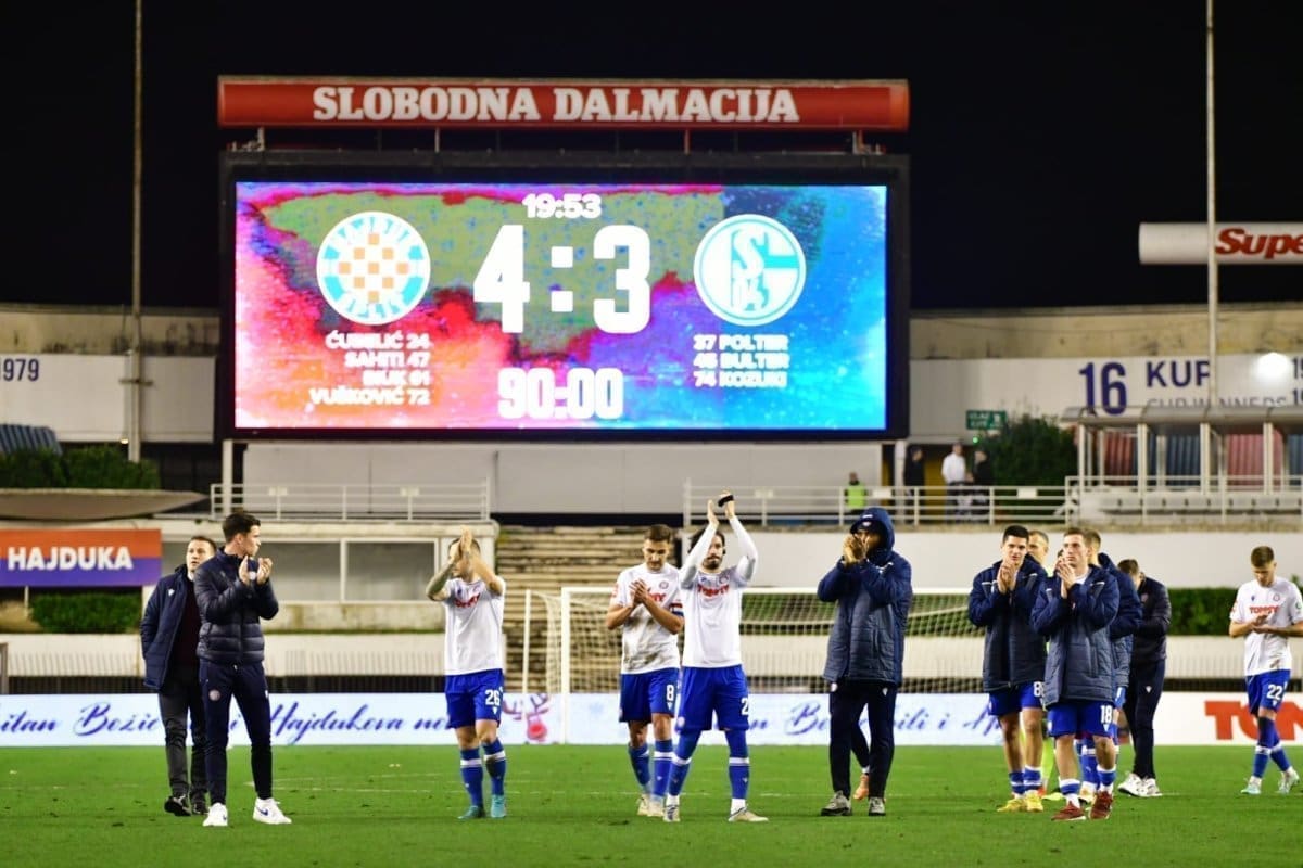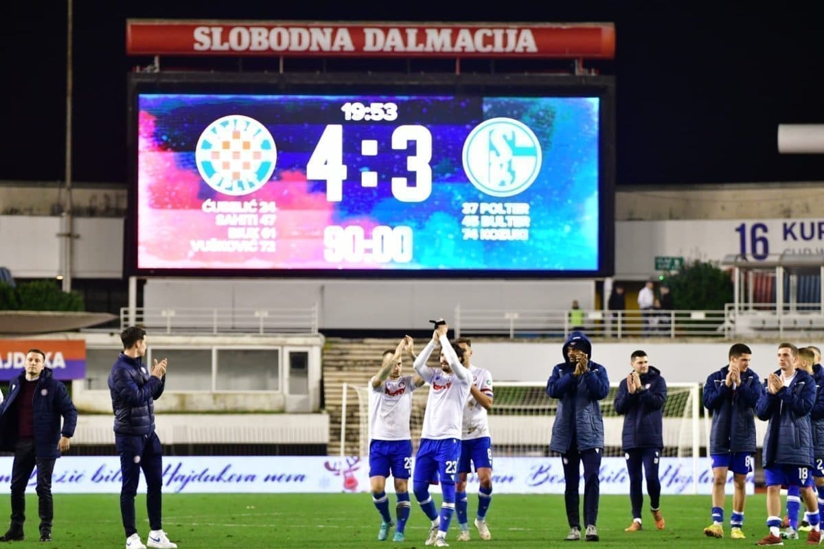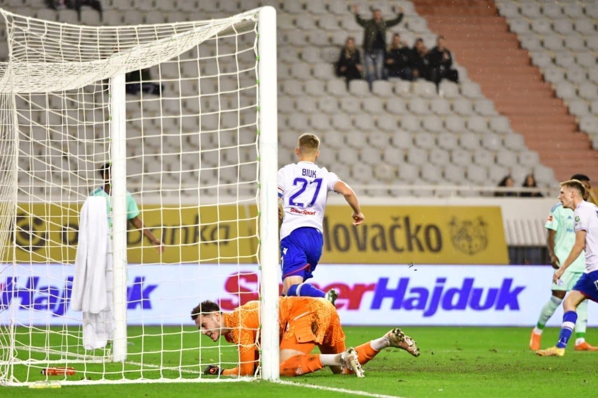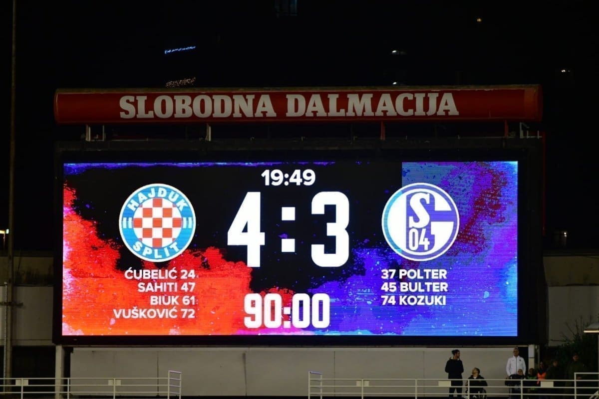 U 61. minuti sjajna Hajdukova akcija za 3:2: Pukštas je odlično asistirao, a Biuk mirno poentirao izbliza. Minutu kasnije Biuk je pokušao nakon odlična driblinga, ali udarac je išao direktno u vratara. Biuk je potom napustio igru, a zamijenio ga je petnaestogodišnji Luka Vušković – i nedugo nakon toga zabio! U 71. minuti nakon Sahitijeva slobodna udarca najbolje se snašao u gužvi i postavio 4:2. Međutim, i Schalke je odmah uzvratio. U 73. minuti Andreas Ivan je ubacio s desne strane, a Kozuki neometano s nekoliko metara zabio za 4:3.