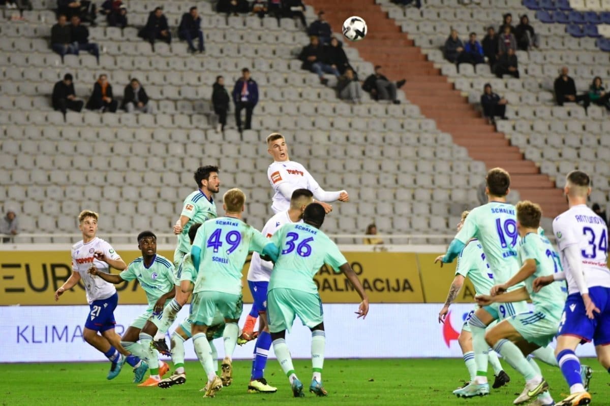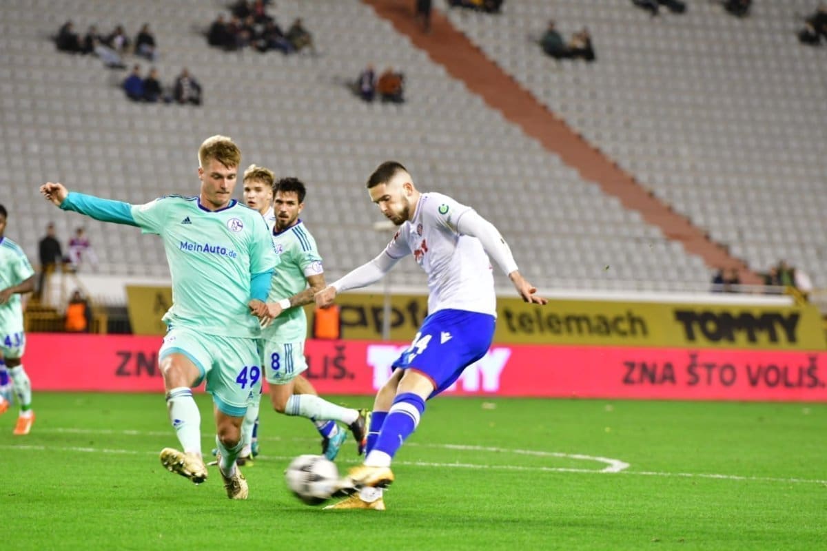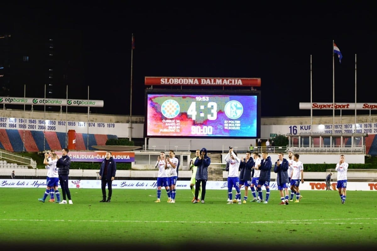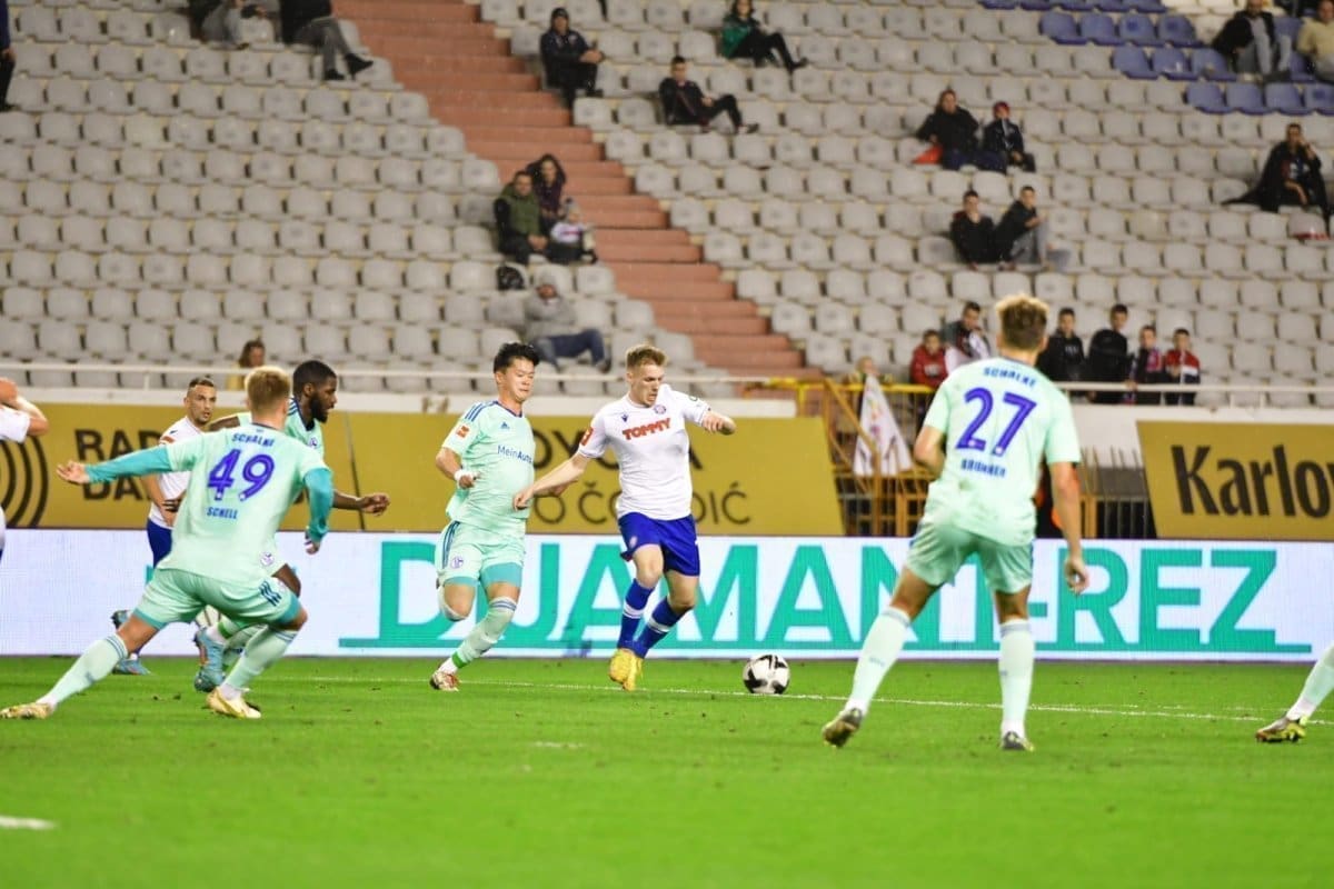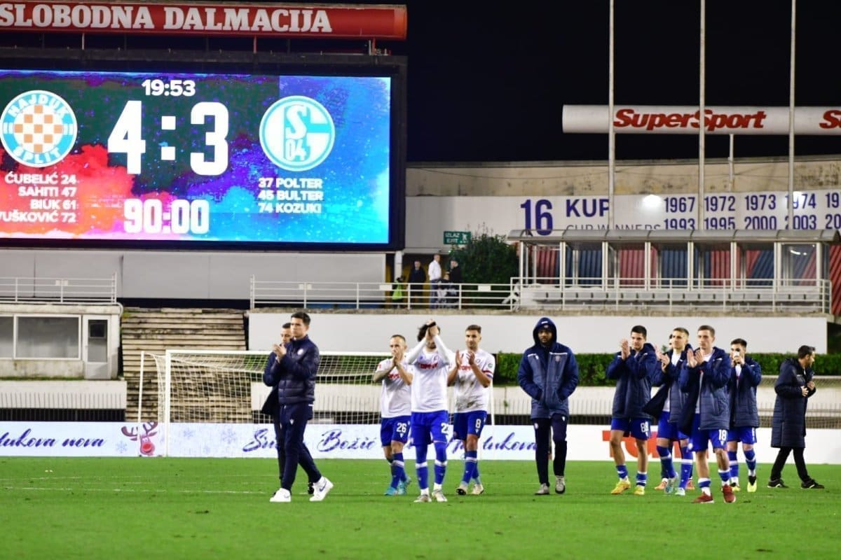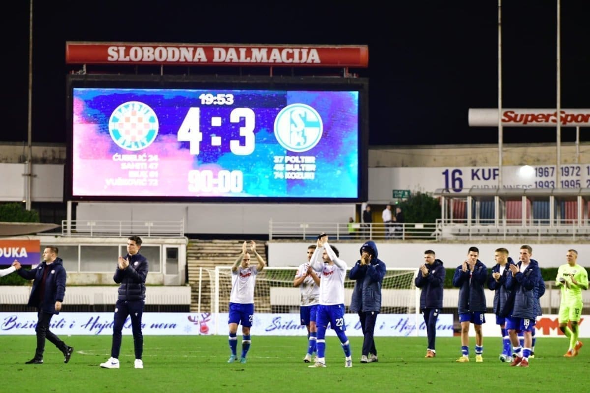 U 61. minuti sjajna Hajdukova akcija za 3:2: Pukštas je odlično asistirao, a Biuk mirno poentirao izbliza. Minutu kasnije Biuk je pokušao nakon odlična driblinga, ali udarac je išao direktno u vratara. Biuk je potom napustio igru, a zamijenio ga je petnaestogodišnji Luka Vušković – i nedugo nakon toga zabio! U 71. minuti nakon Sahitijeva slobodna udarca najbolje se snašao u gužvi i postavio 4:2. Međutim, i Schalke je odmah uzvratio. U 73. minuti Andreas Ivan je ubacio s desne strane, a Kozuki neometano s nekoliko metara zabio za 4:3.
