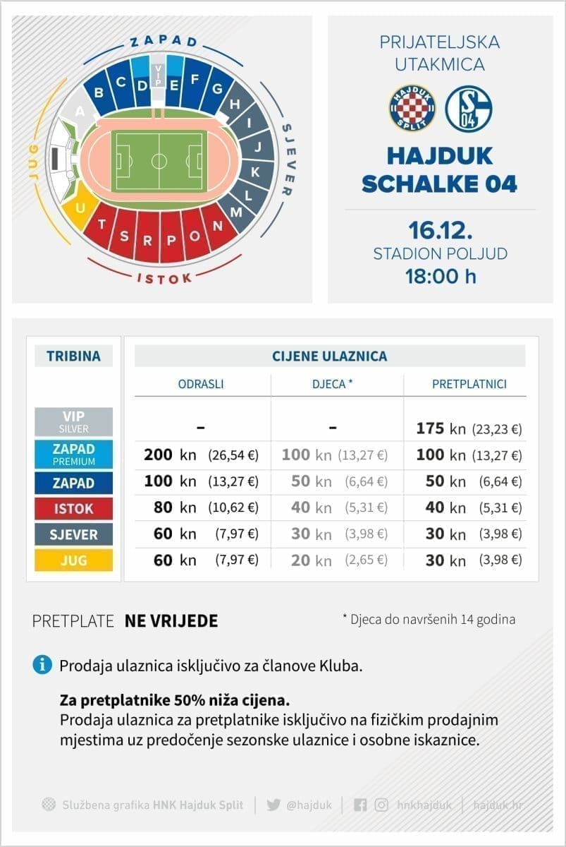 U tijeku je prodaja ulaznica za prijateljski dvoboj između Hajduka i njemačkog Schalkea koji će se odigrati na Poljudu, 16. prosinca s početkom u 18 sati.