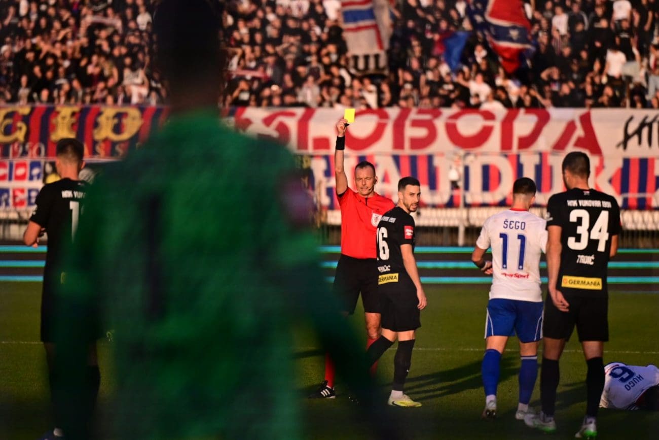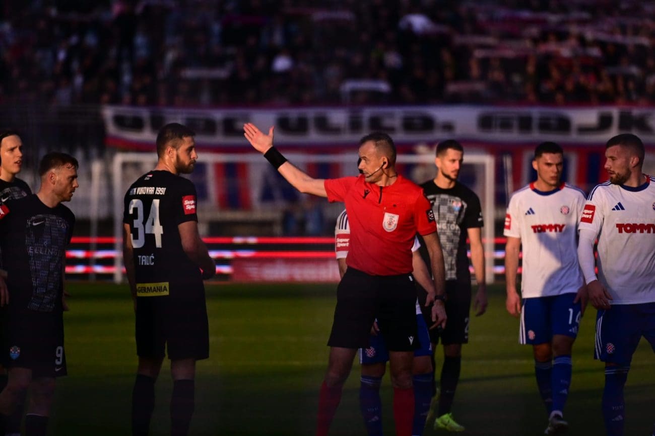 U 17. se minuti ponovno zatresla mreža gostiju nakon dobrog odigravanja Šege, međutim, ponovno je bio u zaleđu pa pogodak nije priznat. Sedam minuta potom požutio je Pavičić nakon sudara s Guillamónom. Zaprijetio je i Vukovar s druge strane, Çalhanoğlu je pucao iskosa, no nije pogodio okvir gola. U 26. je minuti Poljud opravdano poludio: Šego je dobio loptu i krenuo u situaciju jedan na dva, no s leđa ga je srušio Tadić, a sudac Lovrić nije se oglasio. Šego je od nemoći legao na travnjak, a igrač Vukovara izbacio je loptu u aut. Rebić je opravdano poludio jer je Šego bio zadnji igrač, a nije sviran ni faul. Kao epilog situacije Rebić je dobio žuti karton zbog prigovora, a nakon toga je Lovrić otišao pogledati snimku i dosudio slobodni udarac te izravni crveni karton Tadiću.
