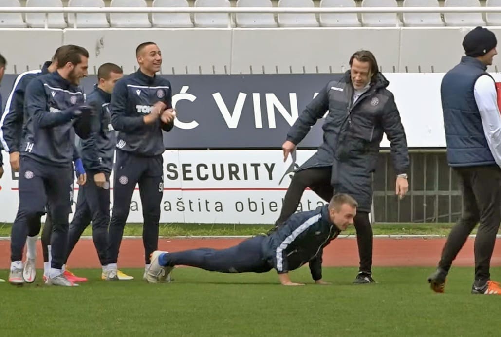 Na videu Hajdukovog treninga dalo se vidjeti kako se zbližava s igračima, posebno prilikom jedne vježbe kada je za ruku povukao Darka Nejašmića i praktički ga natjerao da radi sklekove za kaznu jer je u vježbi ranije pogriješio, prenosi Index.