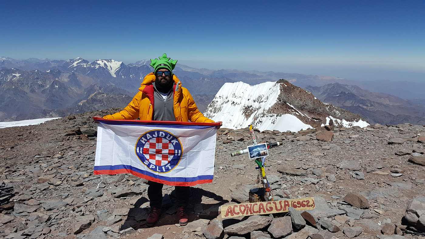 "Cerro Aconcagua - 6962 m. Najviši vrh južne i zapadne Hemisfere. Drugi najviši svjetski summit. 2. osvojeni vrh kontinenta s Hajdukovom zastavom. Hajduk živi vječno!