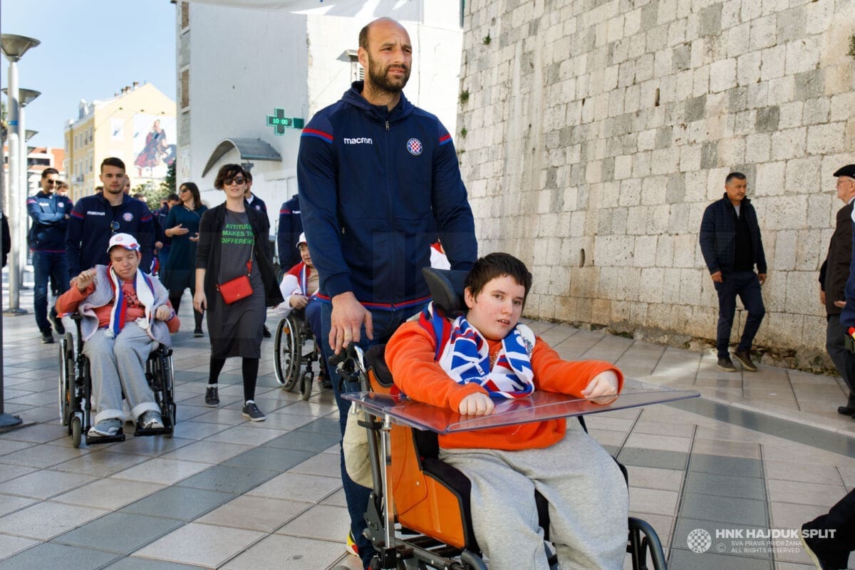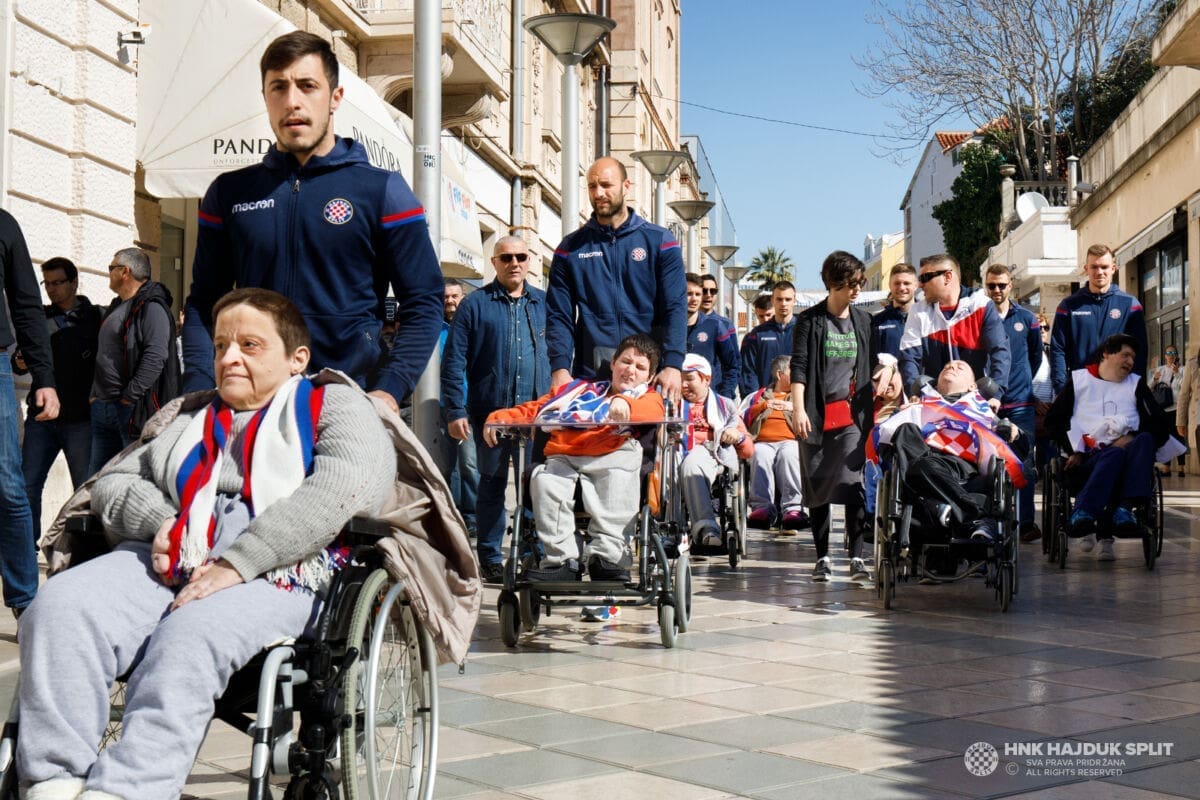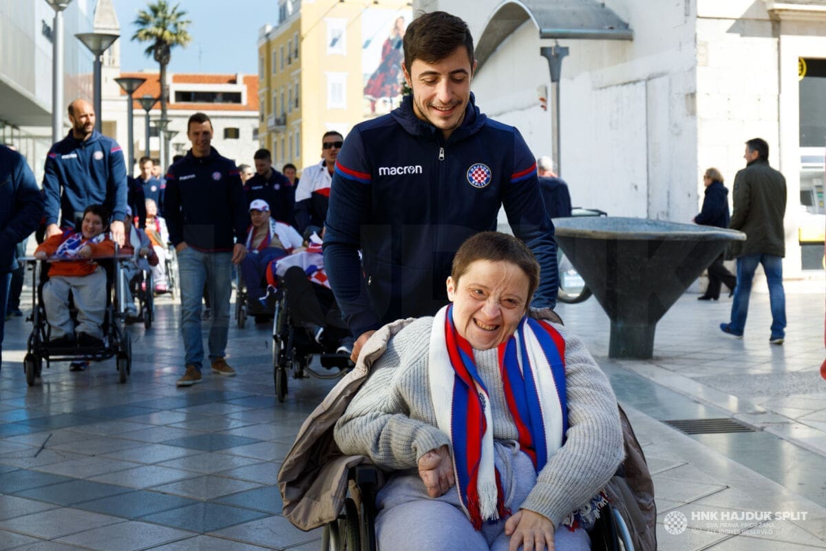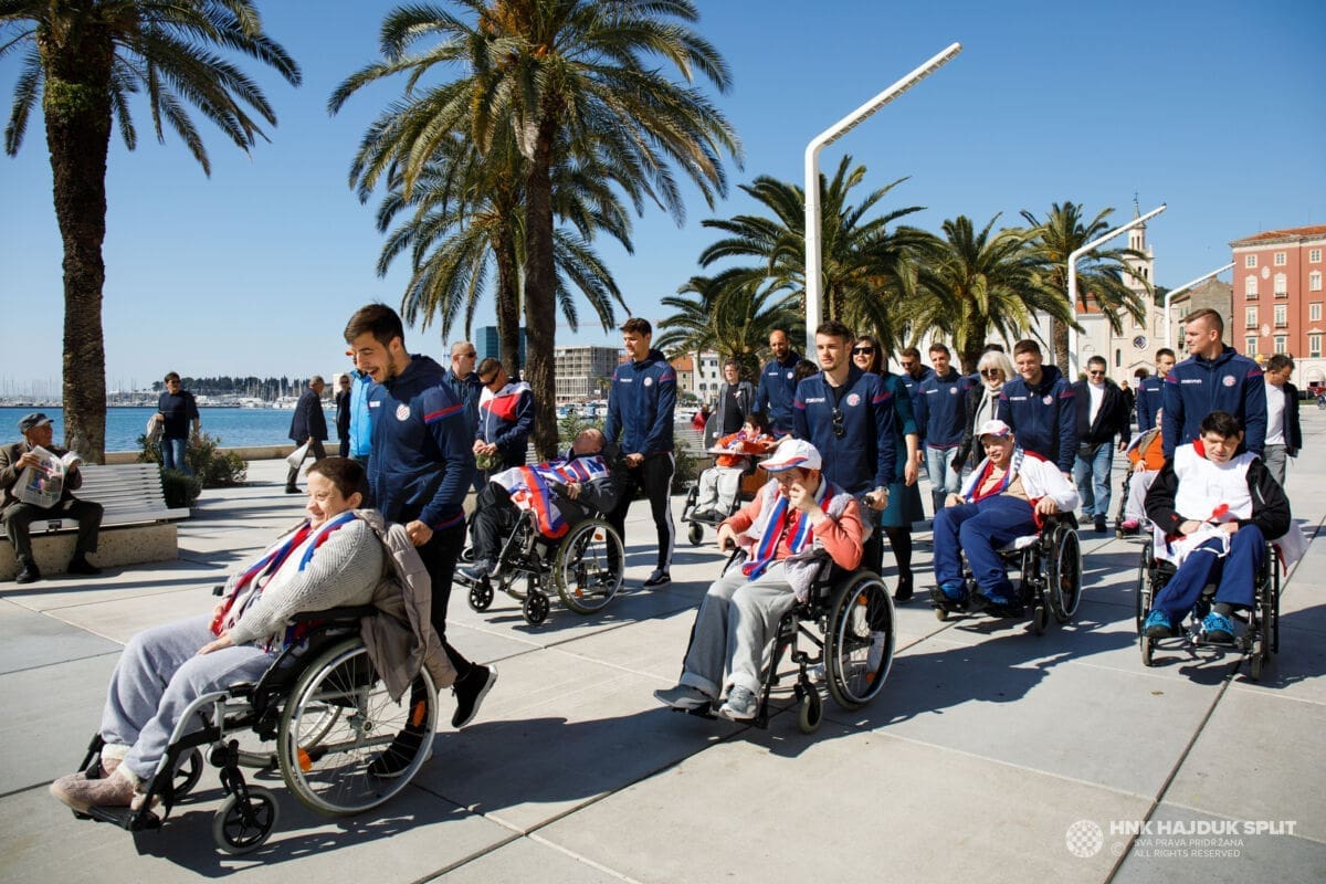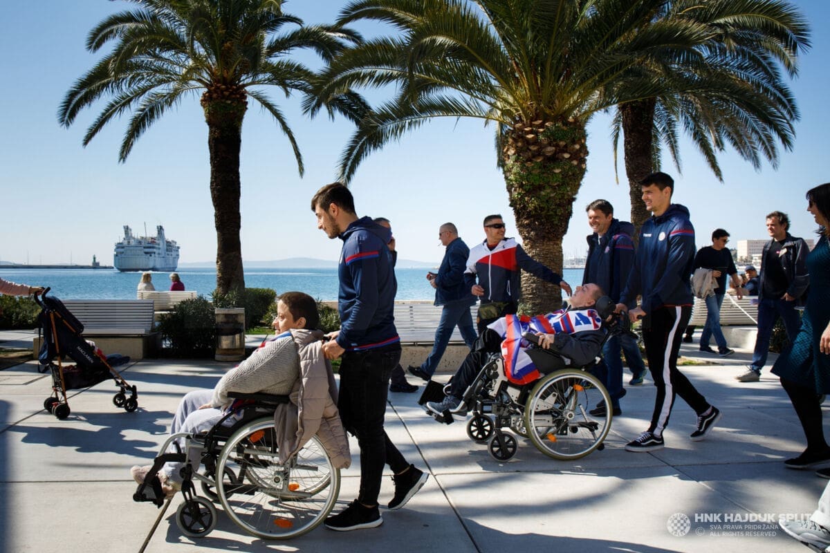 Predvođeni trenerom prve momčadi Sinišom Oreščaninom, hajdukovci su najprije darivali poklonima štićenike "Samaritanca", a nakon toga svi zajedno krenuli su u šetnju preko Marmontove pa do Rive.