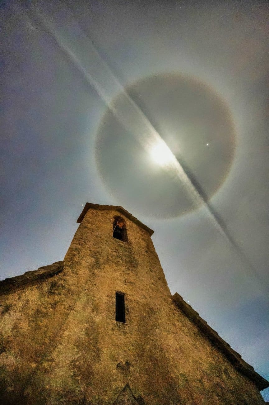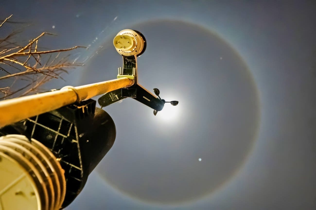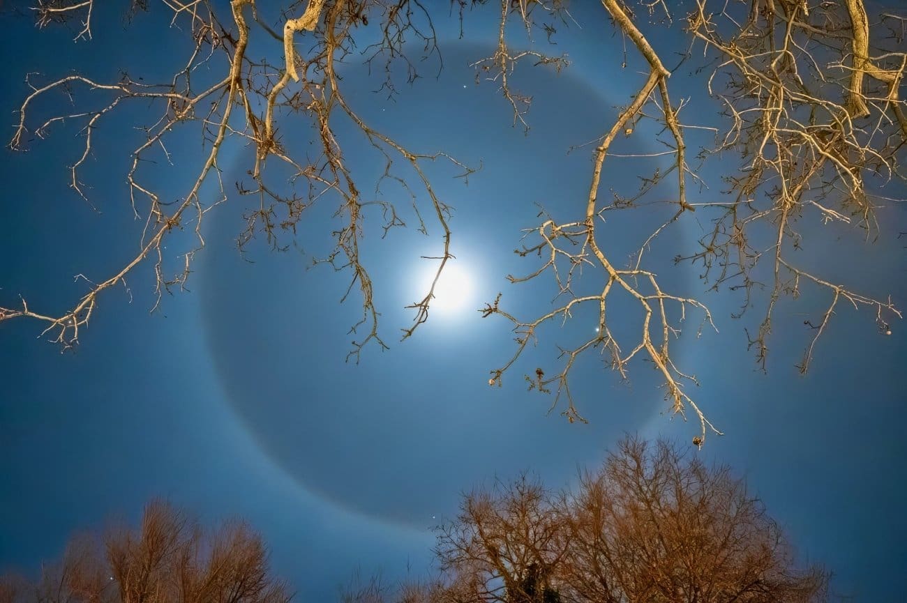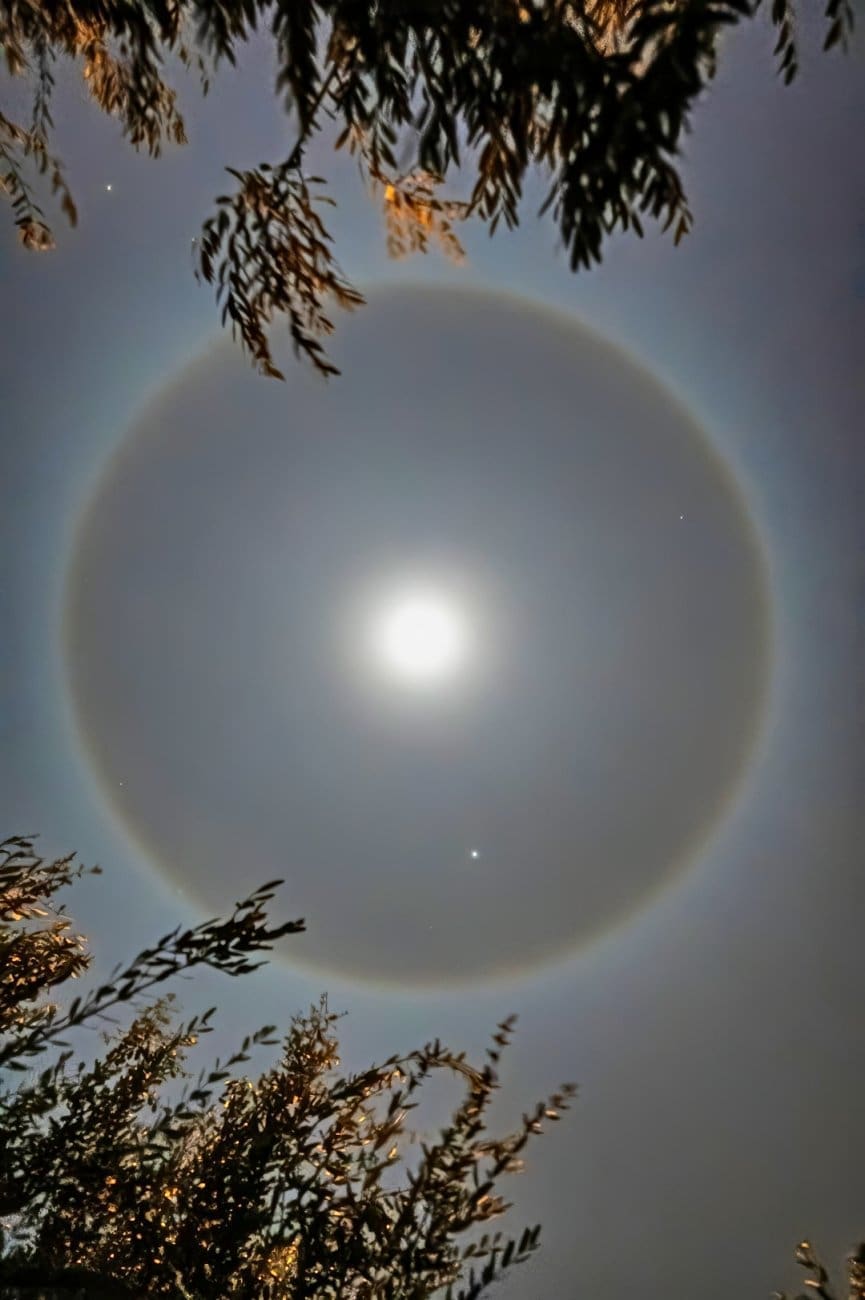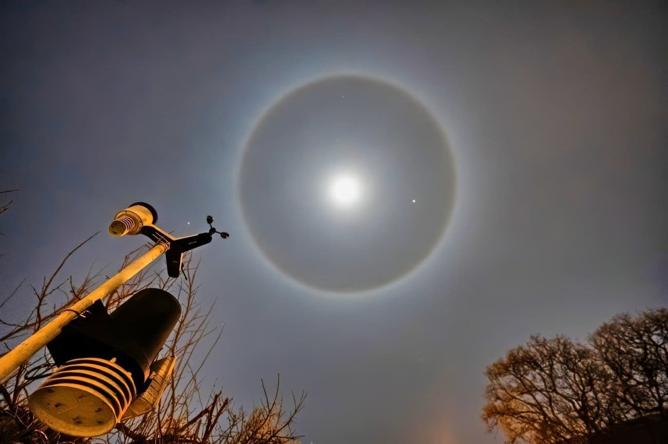 Radi se o oblacima koje nazivamo cirostratusi i predstavljaju slojevitu tanku naoblaku koja za promatrača sa Zemlje poput jednolične mrene preko neba koja ne zaklanja nebeska tijela. Kako se nalaze na visinama gdje je uvijek ispod nule, ovi oblaci se isključivo sastoje od kristalića leda. Zbog toga se lom svjetlosti događa na kristalićima leda, a mi vidimo kružnicu oko Mjeseca.