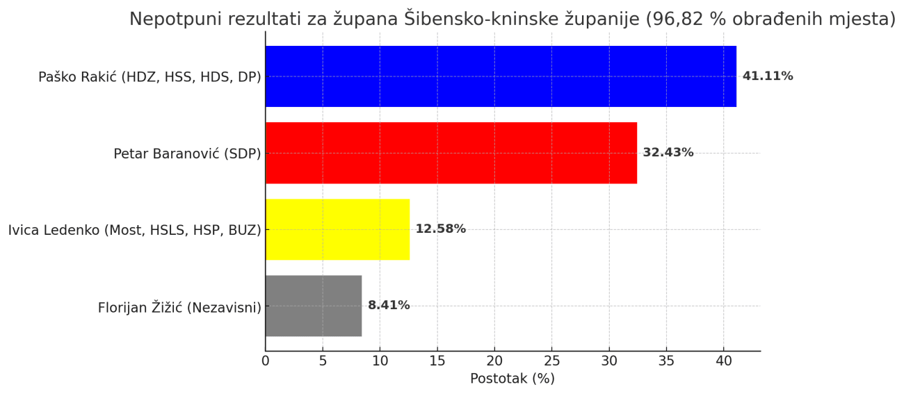 Prema neslužbenim rezultatima s 213 od ukupno 220 biračkih mjesta (96,82 %), u drugi krug izbora za župana Šibensko-kninske županije ulaze kandidati HDZ-a i SDP-a – Paško Rakić i Petar Baranović.