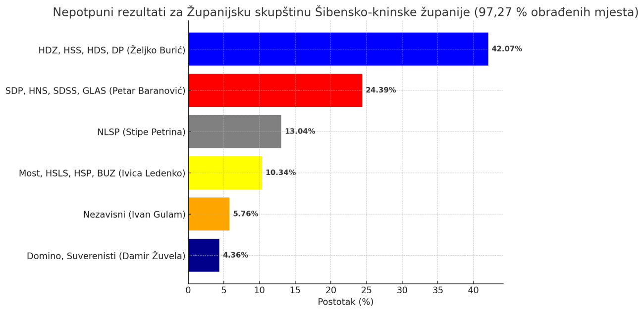 Prema neslužbenim rezultatima s 214 od ukupno 220 biračkih mjesta (97,27 %), lista HDZ-a, HSS-a, HDS-a i Domovinskog pokreta, koju predvodi Željko Burić, trenutačno vodi u utrci za Županijsku skupštinu Šibensko-kninske županije s osvojenih 42,07 posto glasova (15.237 glasova).