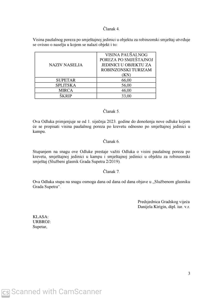 Na 17. sjednici gradskog vijeća Grada Supetra, zakazanoj za ovaj utorak, 06.12. 2022. god., kao 8. točka Dnevnog reda predložen je "Prijedlog Odluke o visini paušalnog poreza po krevetu, smještajnoj jedinici u kampu i smještajnoj jedinici u objektu za robizonski smještaj", izvijestio je Nikola Rendić, predsjednik HDZ-a Supetar.