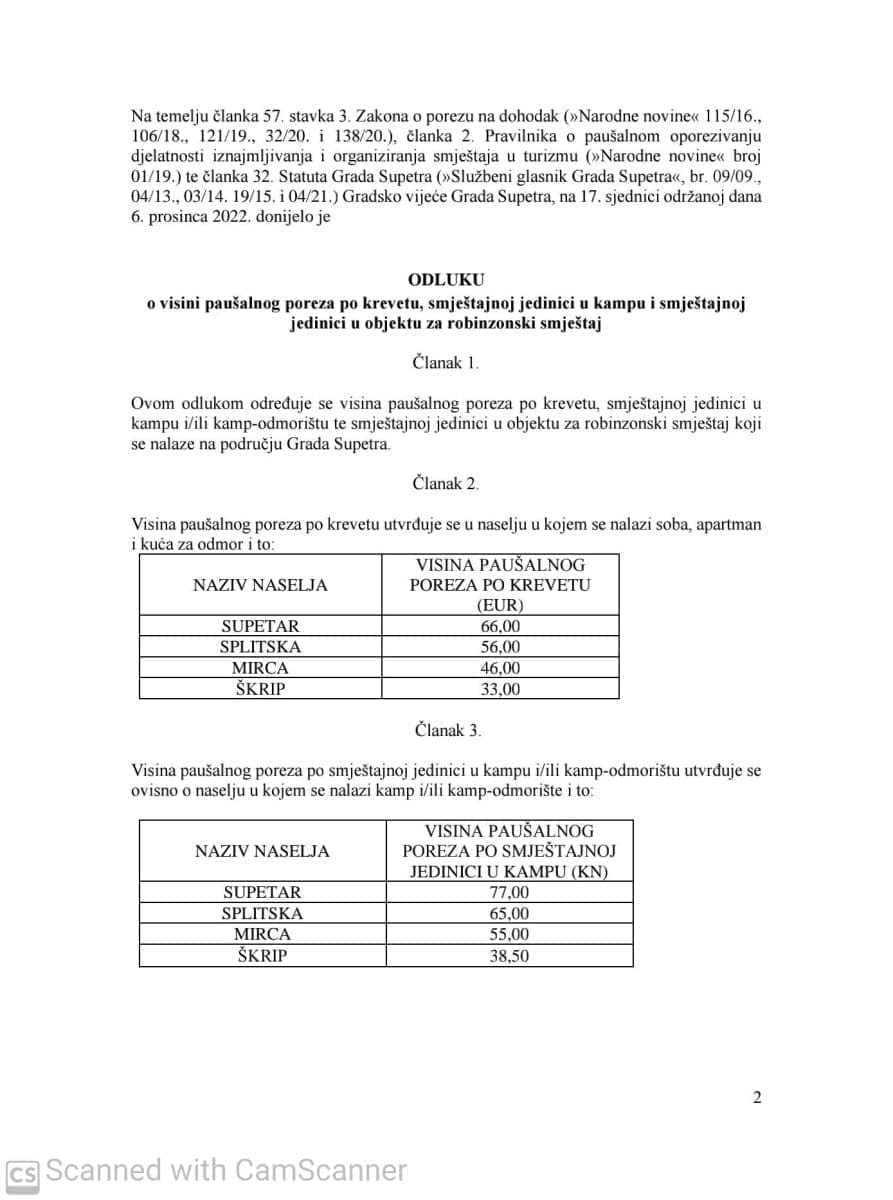 Na 17. sjednici gradskog vijeća Grada Supetra, zakazanoj za ovaj utorak, 06.12. 2022. god., kao 8. točka Dnevnog reda predložen je "Prijedlog Odluke o visini paušalnog poreza po krevetu, smještajnoj jedinici u kampu i smještajnoj jedinici u objektu za robizonski smještaj", izvijestio je Nikola Rendić, predsjednik HDZ-a Supetar.