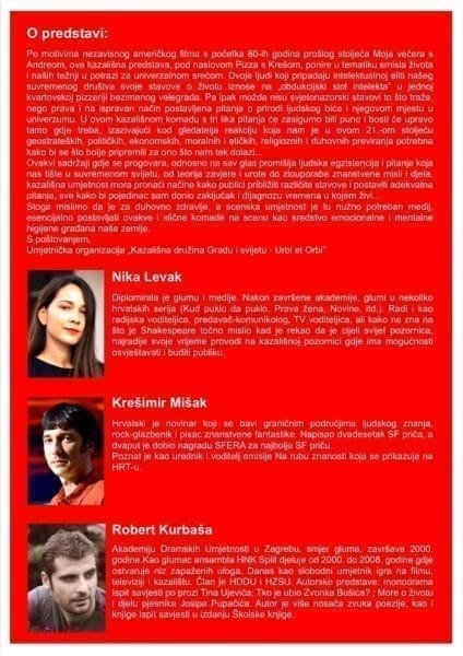 Otkrio nam je da je Krešo napravio veliki odmak od sebe. Kurbaša je preuzeo ulogu čovjeka kojeg zanimaju teorije zavjere, urote i ezoterične stvari. Kratko nam je predstavio sadržaj predstave navodeći da su Krešo i Robi dugi niz godina bili dobri prijatelji, međutim u jednom perioda života se razilaze te se u predstavi dešava njihov ponovni susret u bezimenoj pizzeriji. Nakon niza godina na prijedlog Kreše.