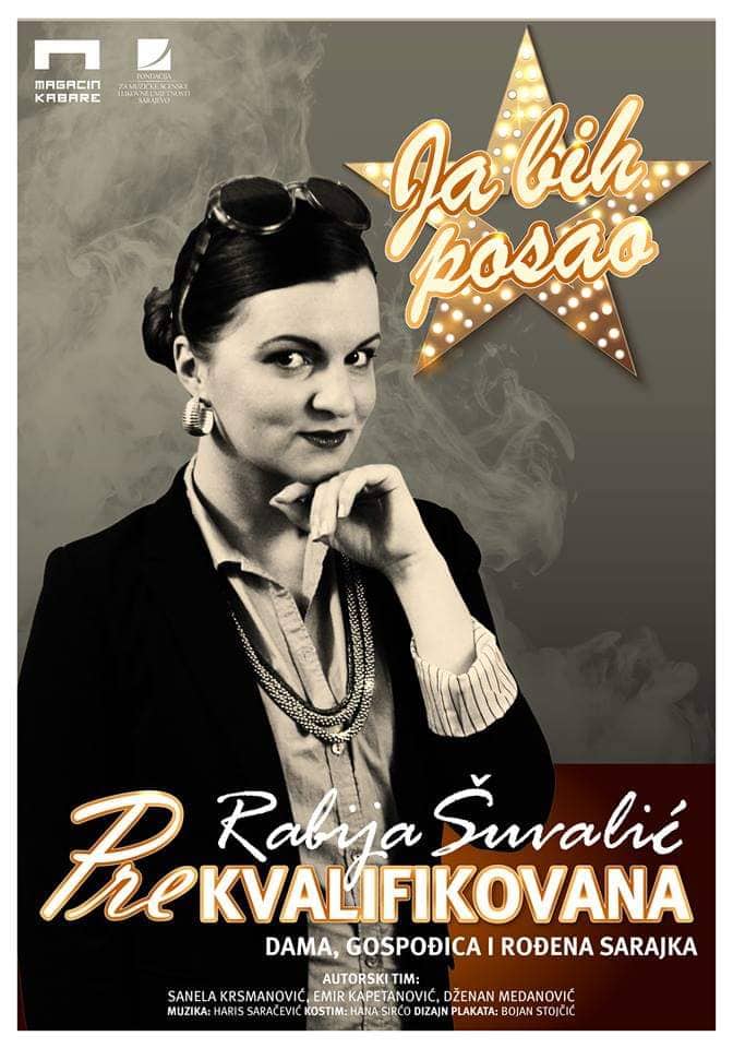 PREKVALIFIKOVANA je kabare koji prati avanture bivše šalterske službenice Rabije Šuvalić koja pet godina nakon otkaza pokušava da pronađe novi posao, ali se ispostavlja da je za svaki prekvalifikovana. Ona je Rabija Šuvalić.