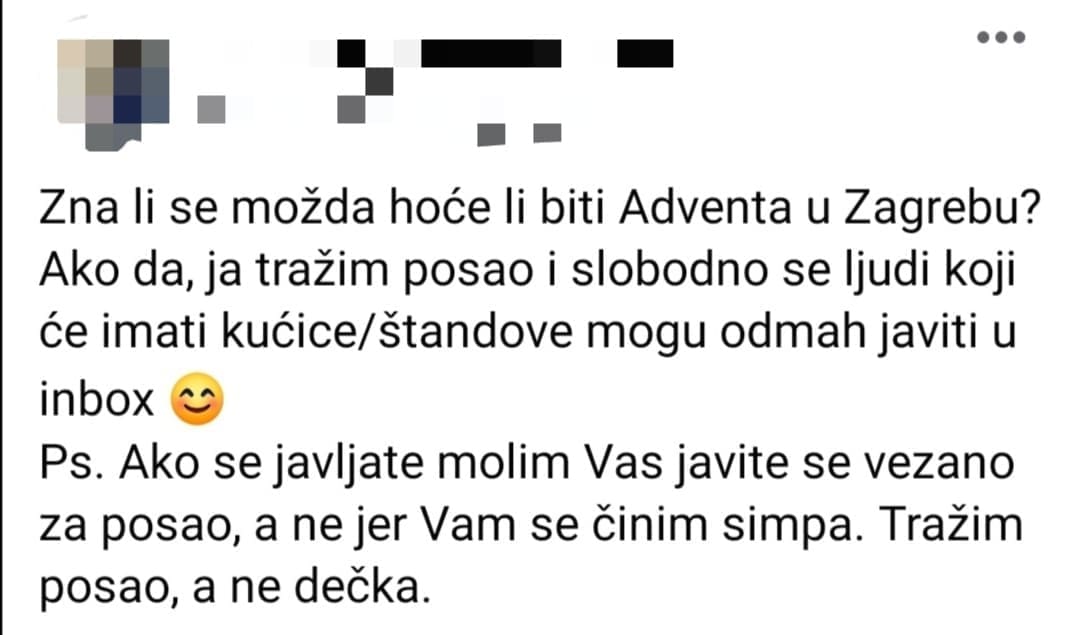 Naime, djevojka je u potrazi za poslom i u objavi je naglasila da ima želju raditi na manifestaciji „Adventa u Zagrebu“. Međutim ni sama nije sigurna ima li smisla njezin oglas jer je organizacija navedene manifestacije pod velikim upitnikom.