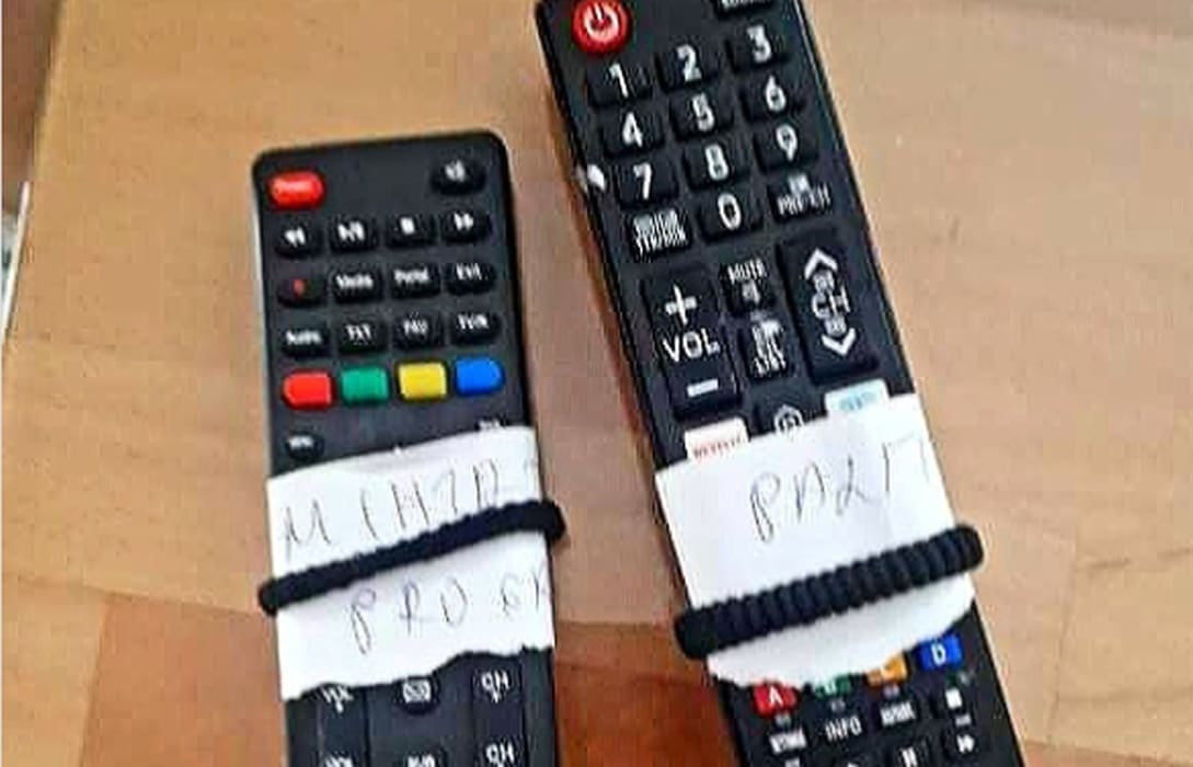 Naime, na slici su dva daljinska upravljača, a na svakog od njih zakačen je papir s kratkom uputom za što točno služi.