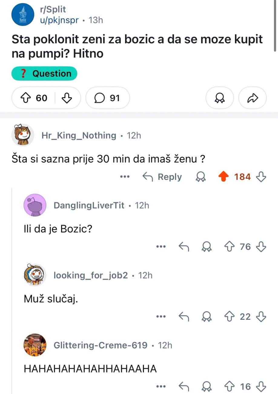 Pitanje jednog korisnika na Redditu izazvalo je lavinu reakcija i humora, a objava je u kratkom vremenu privukla velik broj komentara i pozitivnih ocjena. Na podforumu r/Split, korisnik je postavio pitanje: „Šta poklonit ženi za Božić, a da se može kupit na pumpi? Hitno“, očito sugerirajući da je u posljednji trenutak u potrazi za božićnim poklonom.