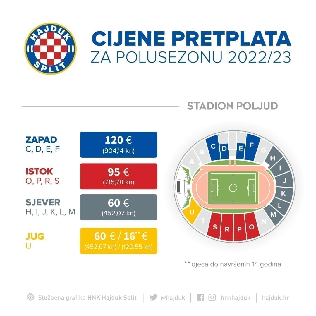 Kupnjom polusezonske pretplate osiguravate sebi mjesto za utakmice SuperSport HNL te utakmice SuperSport Hrvatskog nogometnog kupa (osim finala) koje se u organizaciji HNK Hajduk Split održavaju na Poljudu, u natjecateljskoj sezoni 2022/2023.