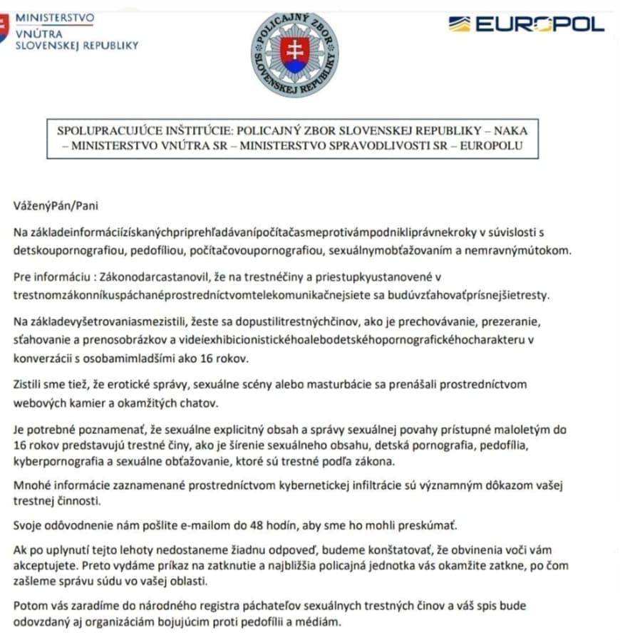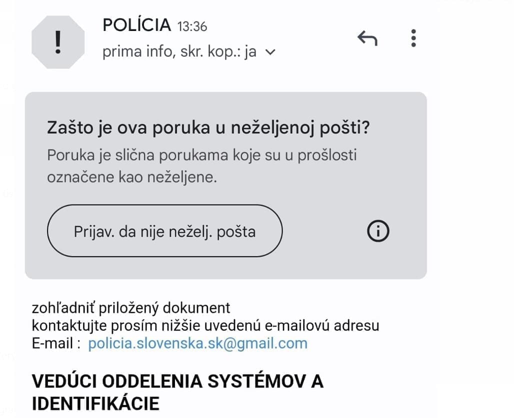 Splićani nam se u posljednjim danima žale da na svoj privatni mail račun dobivaju neobičnu poruku. Naime, kako je vidljivo, poruka stiže od Slovačke policijske uprave, no iz samog sadržaja iste vidljivo je da je riječ o klasičnoj prijevari.