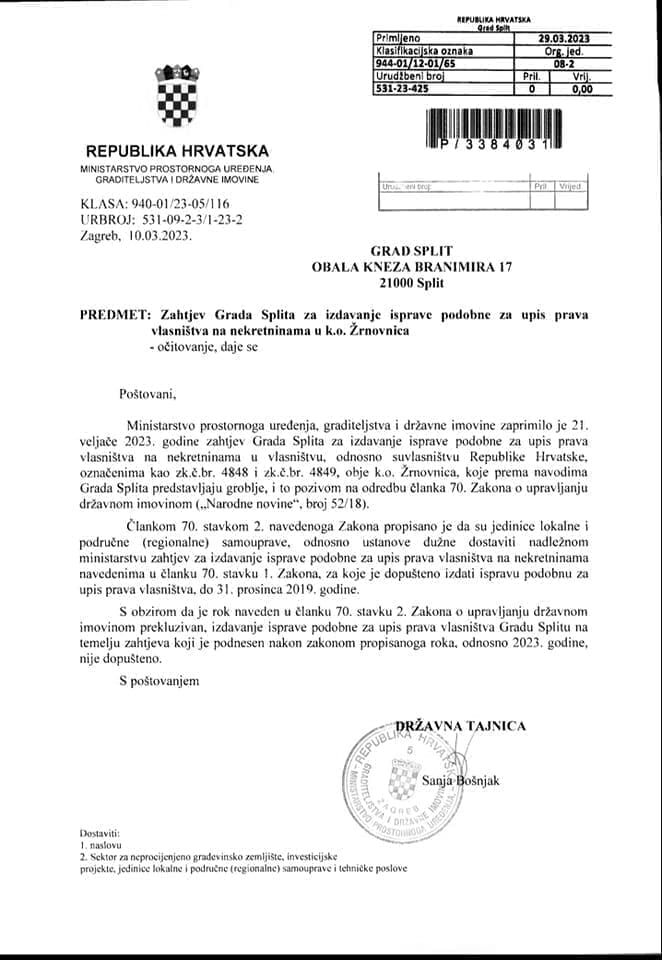 Ministarstvo prostornog uređenja, graditeljstva i državne imovine zaprimilo je 21. veljače ove godine 'zahtjev Grada Splita za izdavanje isprave podobne za upis prava vlasništva na nekretninama u k.o. Žrnovnica'. Dvije čestice koje u naravi predstavljaju groblje. Međutim, stoji u odgovoru kojeg potpisuje državna tajnica Sanja Bošnjak, 'rok naveden u članku 70. stavku 2. Zakona o upravljanju državnom imovinom je prekluzivan, izdavanje isprave podobne za upis prava vlasništva Gradu Splitu na temelju zahtjeva koji je podnesen nakon propisanog roka, odnosno 2023. godine, nije dopušteno.'