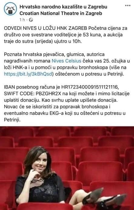 Hrvatsko narodno kazalište u Zagreb jučer je na svom Facebook profilu objavilo aukciju za društvo Nives Celzijus u loži, piše Jutarnji list.