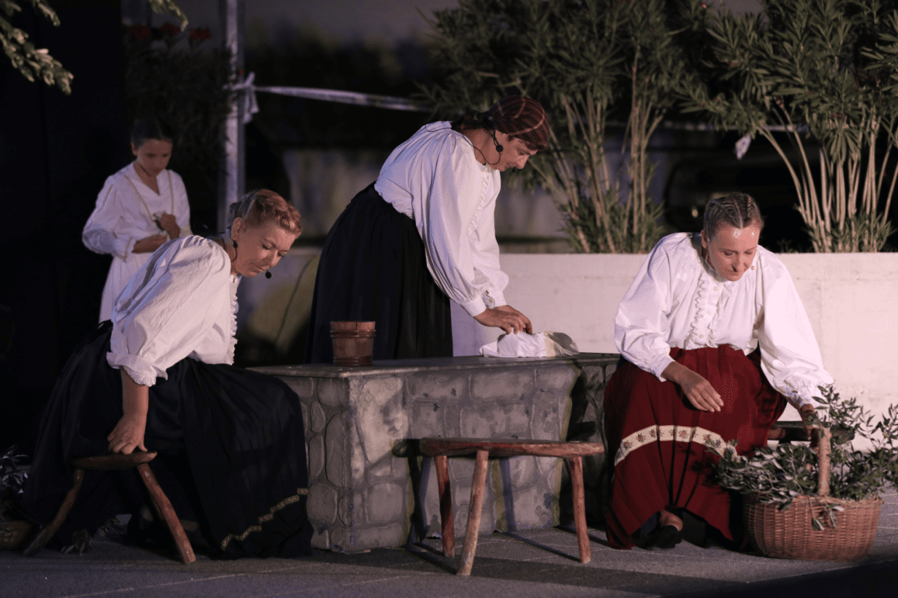 Scenarij potpisuju M. Kažotić i Marijana Vulas, a režiju i adaptaciju Marijana Vulas, koja je u originalnu priču utkala čakavski izričaj, kao i prikaz običaja dote i vjenčanja, tradicijskih pjesama i plesova. Predstava je premijerno izvedena u ljeto 2023., igrala je povodom Dana grada Kaštela u ožujku 2024., a gostovala je i u Maloj dvorani Vatroslava Lisinskog u Zagrebu u veljači 2025.