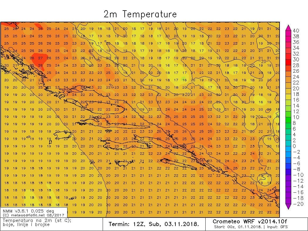 Dani nadolazećeg vikenda bit će kao stvoreni za aktivnosti na otvorenom. Bit će djelomično sunčano i u većini predjela suho. U subotu još u početku slabo jugo, do večeri će zapuhati slaba bura, a u nedjelju će ponovno zapuhati umjereno jugo u drugom dijelu dana. U subotu će doći do novog zatopljenja pa je čak mjestimično moguće obaranje apsolutnih temperaturnih rekorda za studeni. Najviše dnevne temperature bit će većinom od 22 do čak 27 Celzijevih stupnjeva. U nedjelju tek stupanj do dva niže.