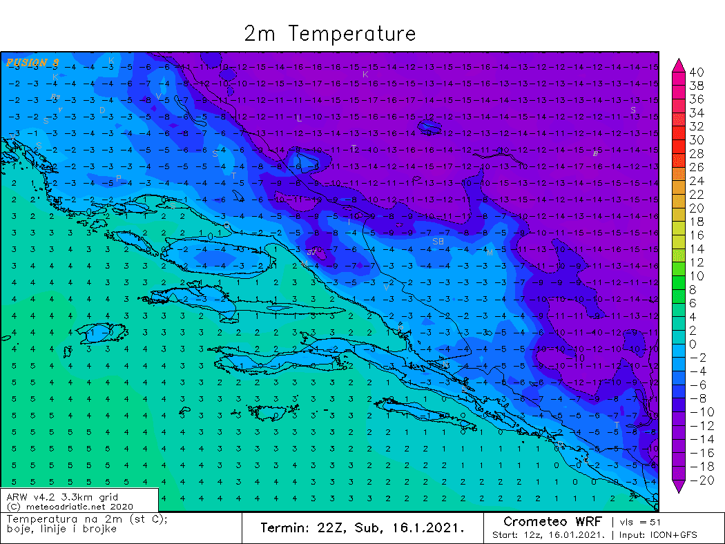 Kako je i bilo najavljeno, vrhunac hladnoće aktualnog hladnog vala, moguće i ovogodišnjeg siječnja općenito, događa se u noći sa subote na nedjelju. U 23 sata Zagora sjeverne Dalmacije već je ponegdje dosegla -6°C, srednje Dalmacije -5°C, a cijelo šibensko područje također je "utonulo" u minuse. Do jutra je moguće da će u nekim kotlinama Dalmatinske zagore temperature zraka biti oko -10 Celzijevih stupnjeva.
