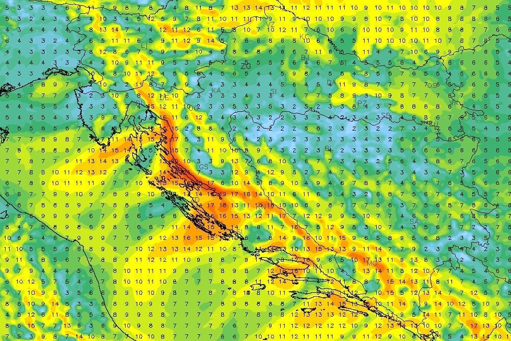 Umjereno do znatno oblačno, povremeno uz kišu, lokalno i pljuskove s grmljavinom bit će u subotu. Krajem dana iznad 1500 metara može biti snijega. Jugo će okretati na oštro i lebić. Jutro relativno toplo, danju malo svježije u odnosu na petak.