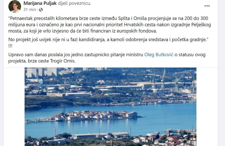 Upravo sam danas poslala još jedno zastupničko pitanje ministru Olegu Butkoviću o statusu ovog projekta, brze ceste Trogir Omiš", napisala je Marijana Puljak u Facebook grupi.