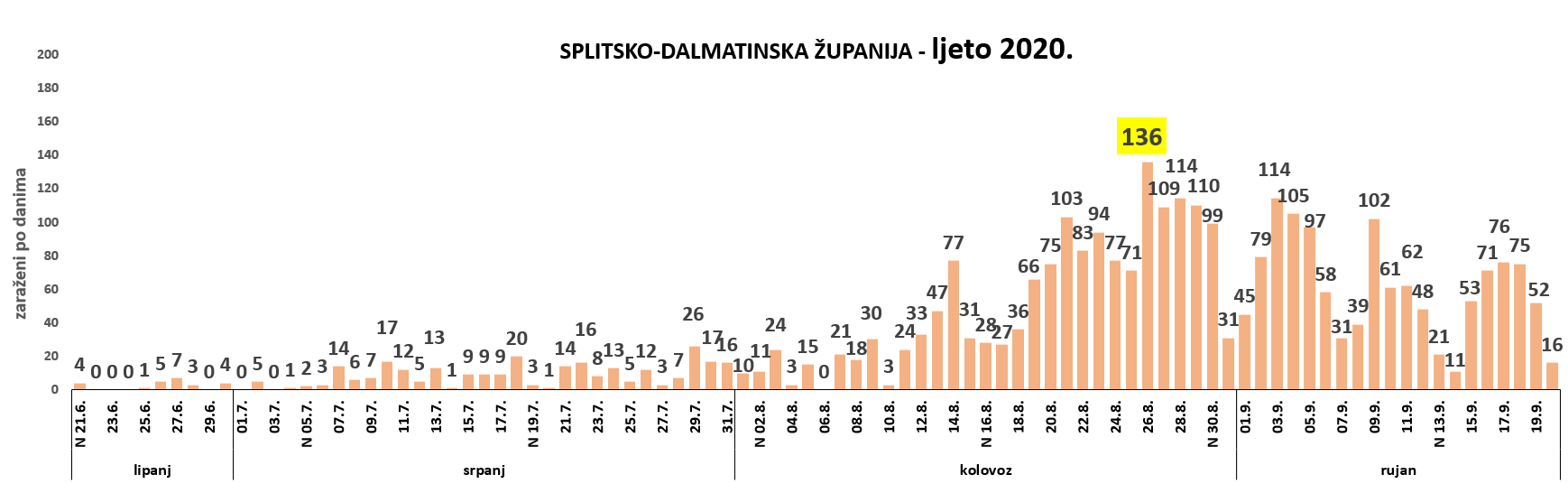 Povećanje broja zaraženih u drugoj polovici kolovoza posljedica je proslava vjenčanja i drugih okupljanja u susjednoj Bosni i Hercegovini. Posljedice takve prakse višesatnog boravka u neventiliranim zatvorenim prostorima najviše su se osjetile u Zagori. Rodbinskim vezama zaražavanje je preneseno i u županijsku središnjicu Split i druge dijelove priobalja. Da je tome tako u mjesecu rujnu, kada se očekivao veći broj zaraženih zbog početka školske godine, dogodilo se suprotno. Rujan, mjesec kasnog ljeta i rane jeseni, imao je manji broj zaraženih nego čisto ljetni mjesec kolovoz.